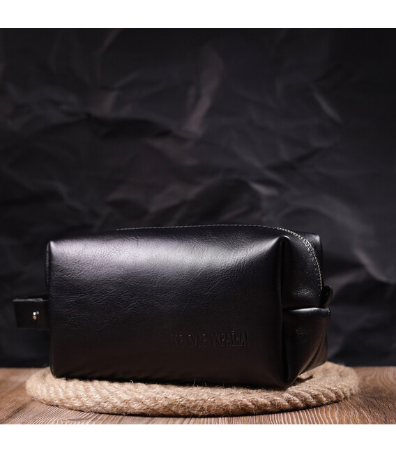 Удобная мужская косметичка, большого размера, из гладкой натуральной кожи с патриотическим тисненим “Все буде Україна”. Аксессуар на все случаи жизни, его можно использовать дома для хранения личных вещей, для поездок, для спорта и прочего. Выполнен аксессуар из износостойкой натуральной кожи высокого качества. Цвет изделия – черный, фактура глянцевая гладкая. Упакован несессер в фирменную сумку-чехол.