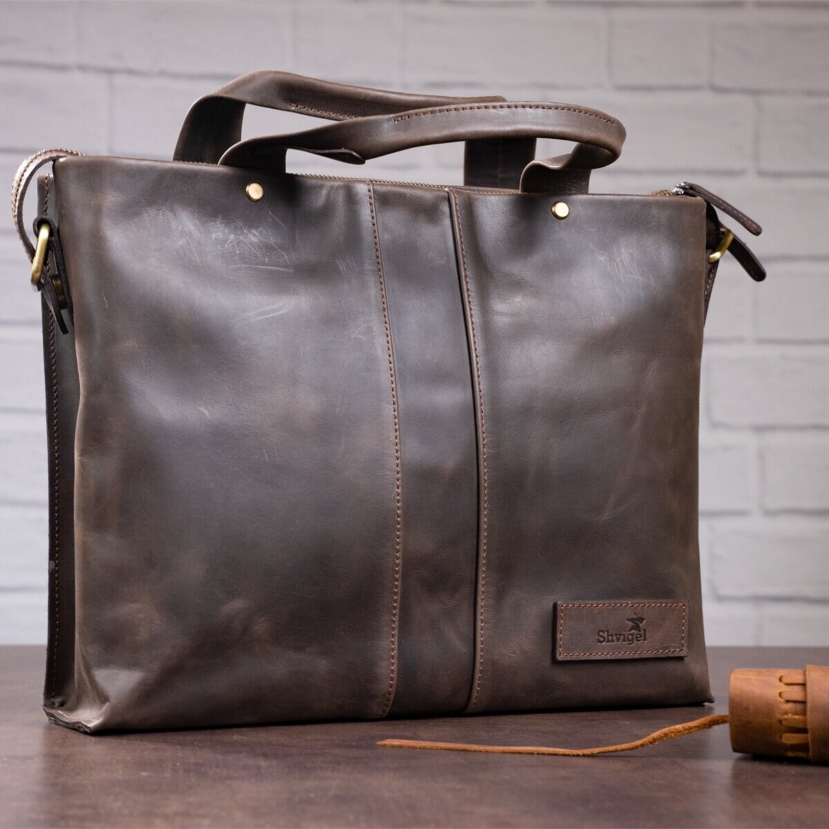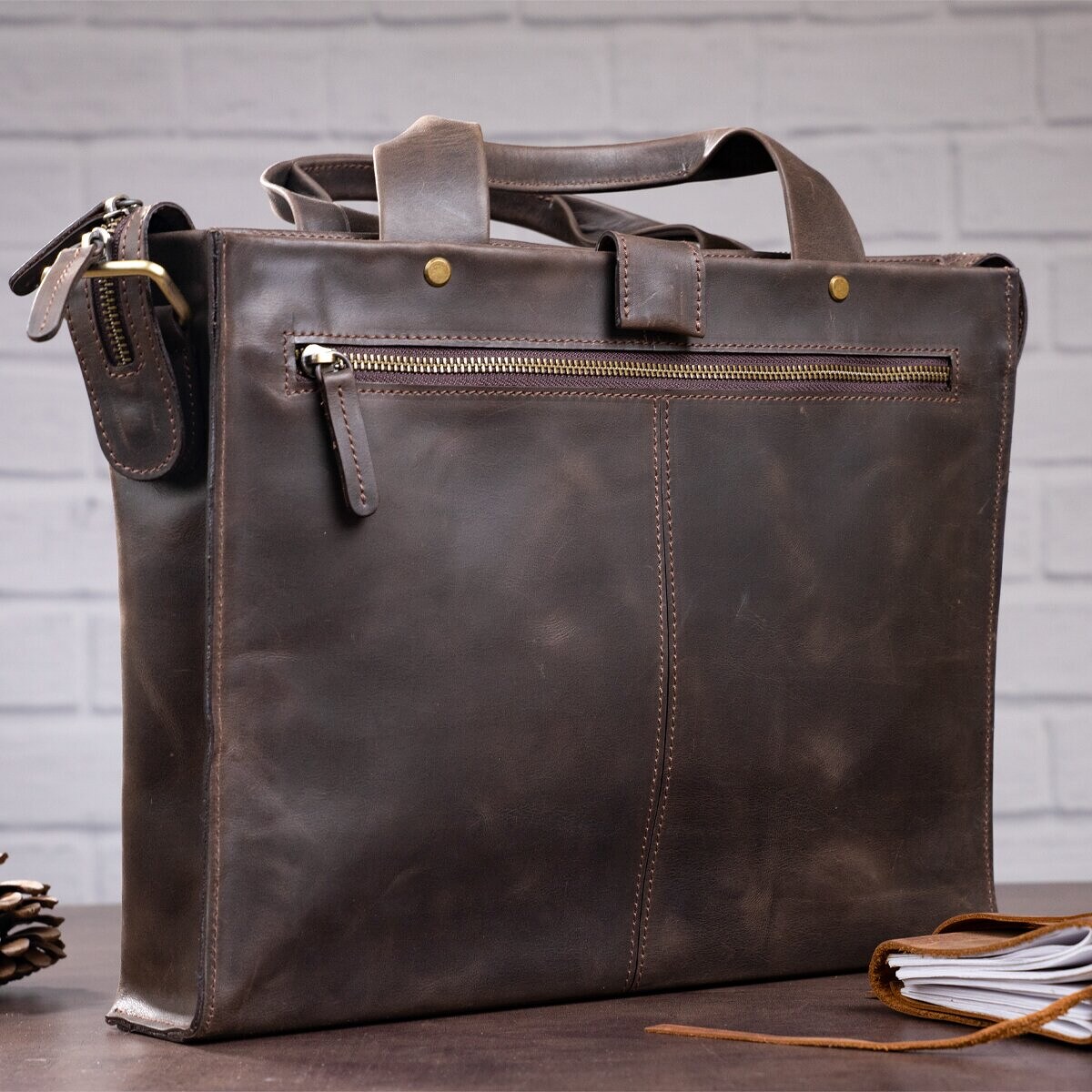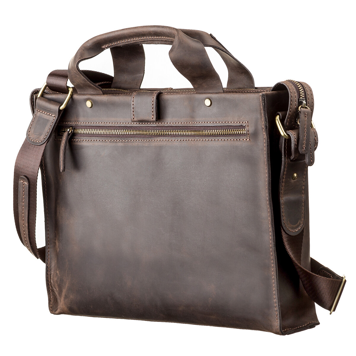 Стильная, современная мужская сумка формата-А4, с двумя удобными ручками, для повседневного использования, позволяющая носить с собой папку с документами, личные вещи. Аксессуар выполнен из натуральной винтажной кожи, характерными признаками которой, являются: неоднородность окраса и потертости, которые придают изделию изысканного, индивидуального вида. Внутри – боковой карман на змейке, два небольших кармана для телефона, мелочей и ручек, упрочненное отделение под планшет.