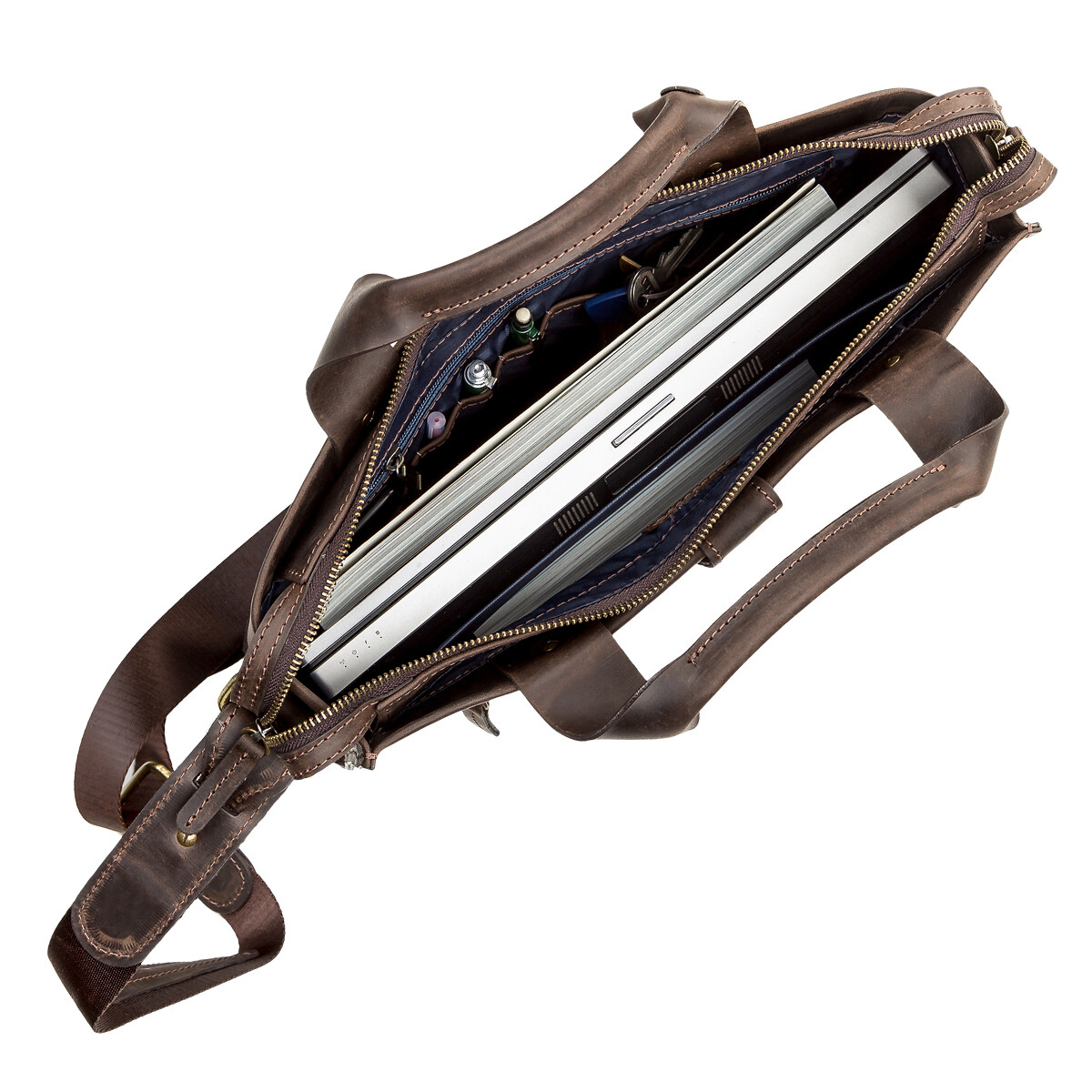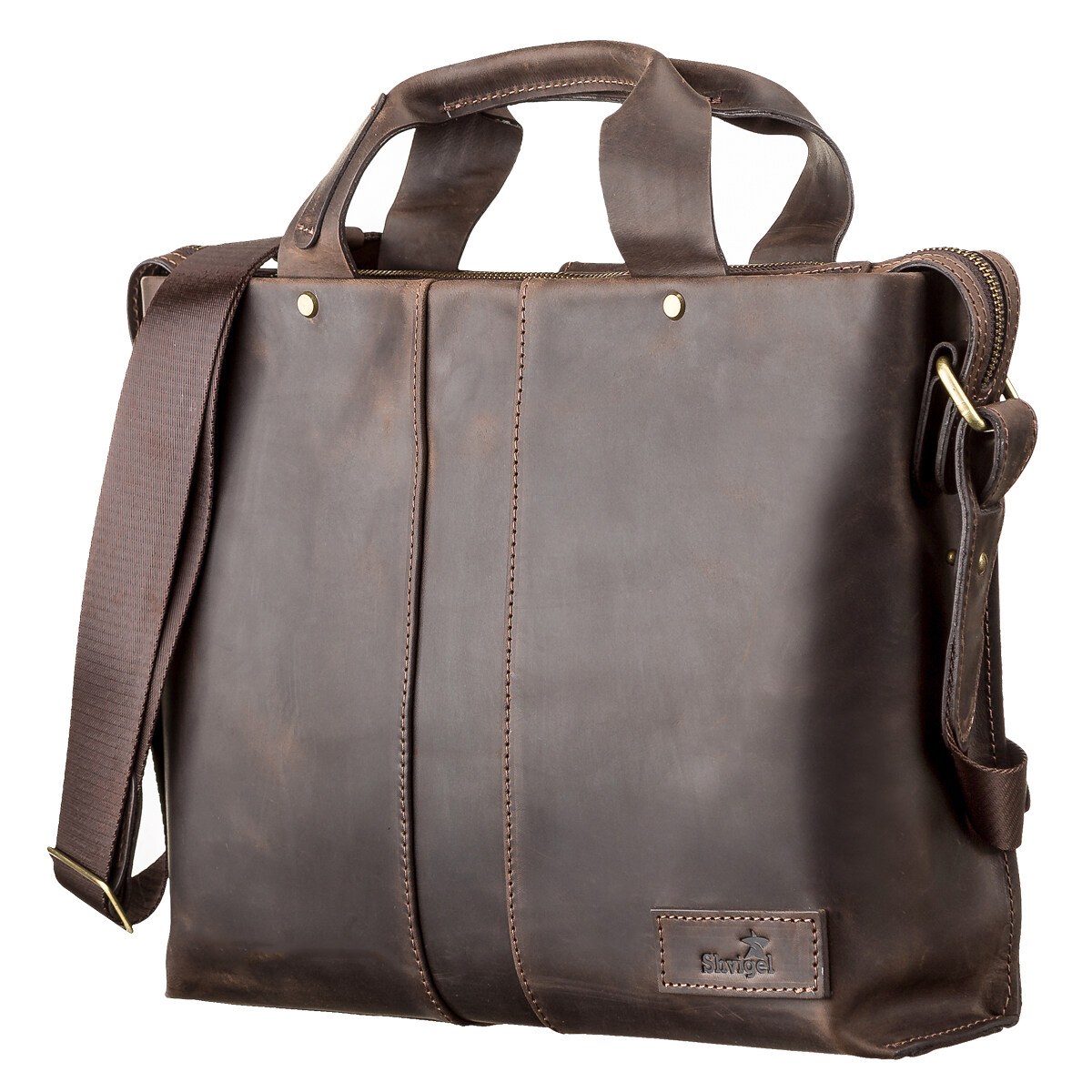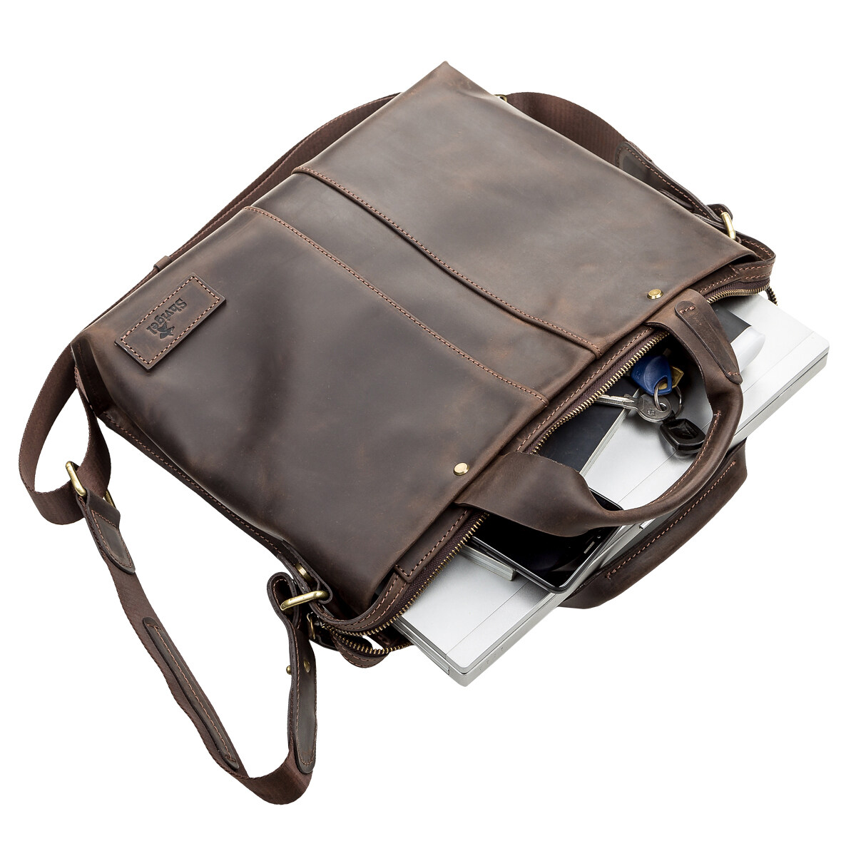 Стильная, современная мужская сумка формата-А4, с двумя удобными ручками, для повседневного использования, позволяющая носить с собой папку с документами, личные вещи. Аксессуар выполнен из натуральной винтажной кожи, характерными признаками которой, являются: неоднородность окраса и потертости, которые придают изделию изысканного, индивидуального вида. Внутри – боковой карман на змейке, два небольших кармана для телефона, мелочей и ручек, упрочненное отделение под планшет.