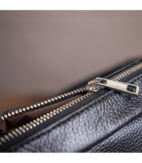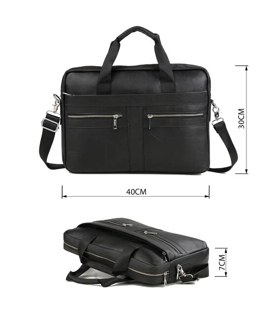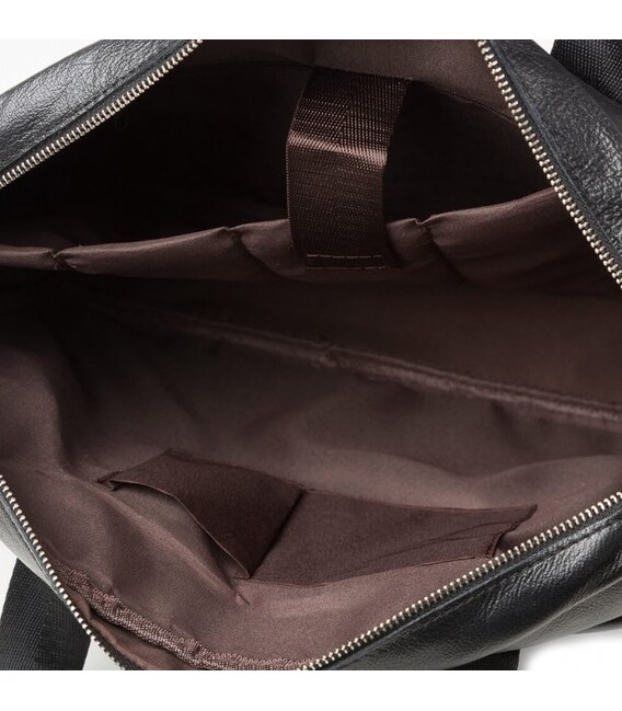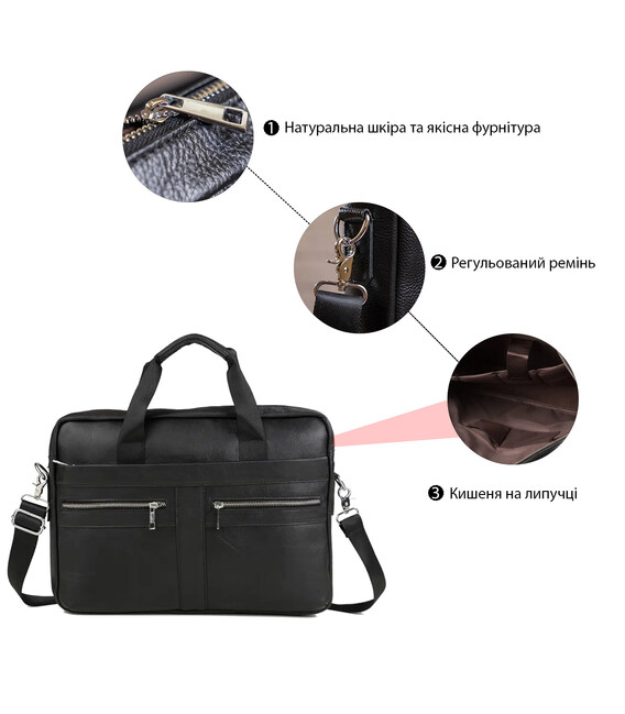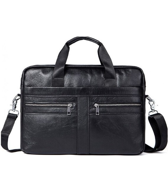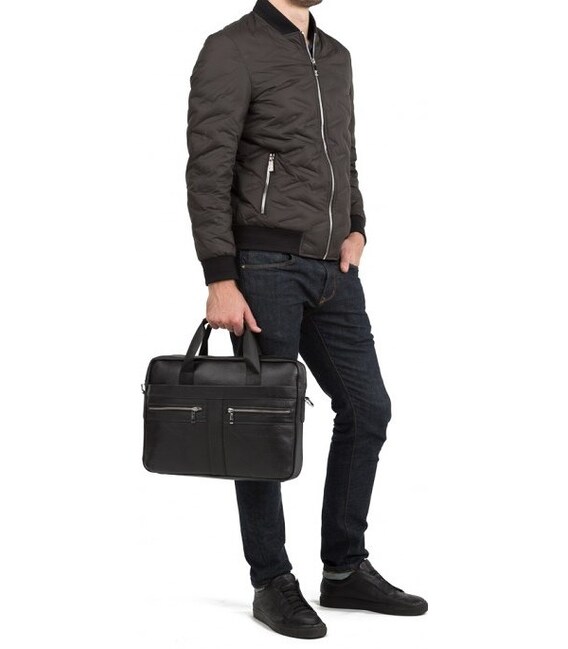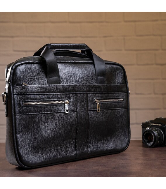 Вместительная мужская сумка с отделением для небольшого ноутбука 15”, а также документов формата А4. Аксессуар выполнен из натуральной зернистой кожи черного цвета. На лицевой стороне данного изделия расположены одно отделение и два кармана на металлических молниях. На задней внешней стороне находится еще одно отделение на молнии. Сумку можно переносить в руке при помощи удобных кожаных ручек, а также через плечо (в комплекте съемный, регулируемый плечевой ремень, который выполнен из текстильного материала). Цвет фурнитуры: серебро.