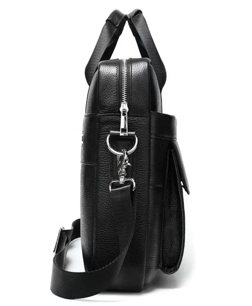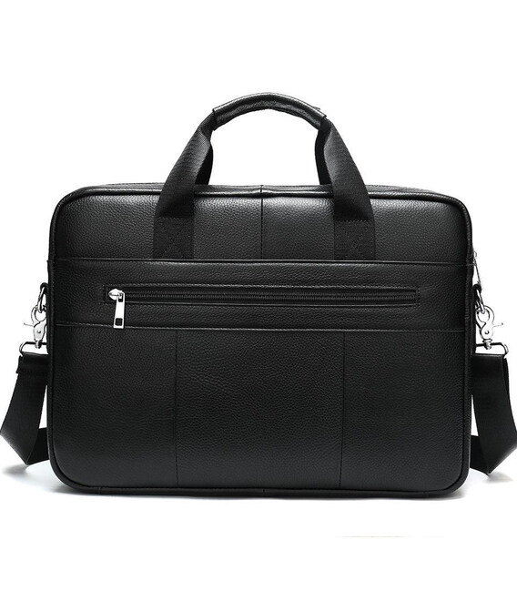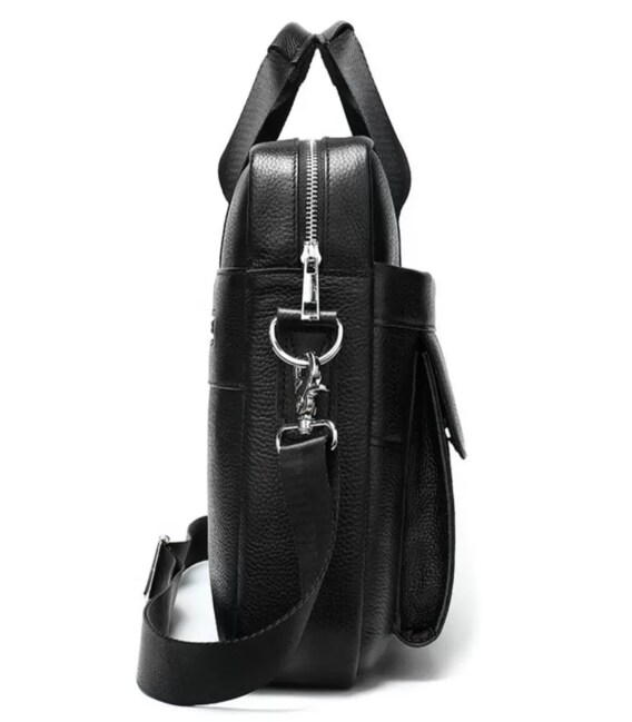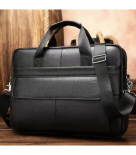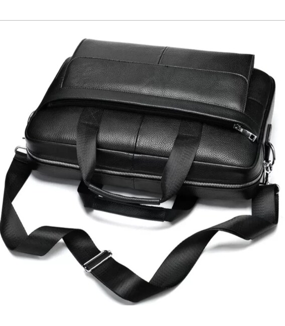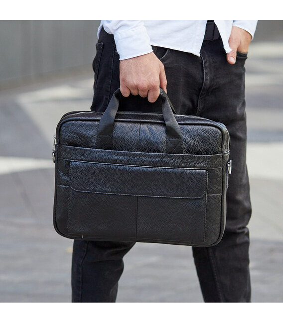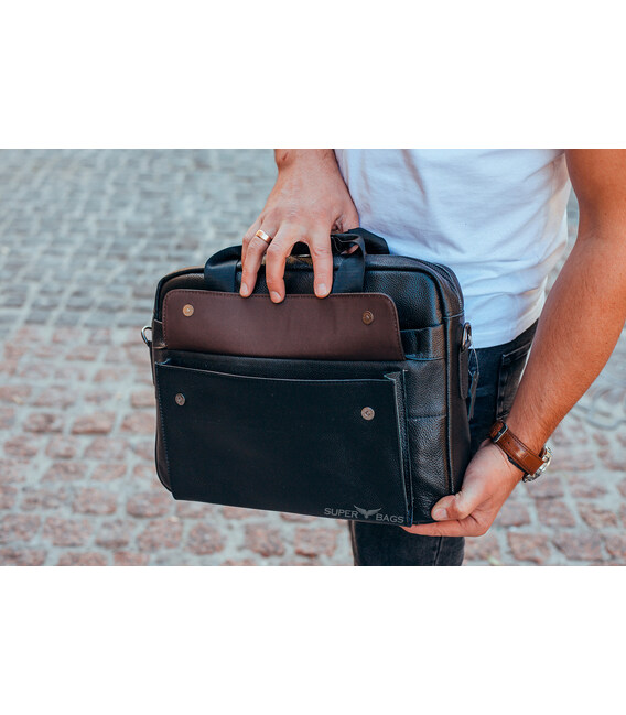 Стильная кожаная сумка для настоящих мужчин: многофункциональная из натуральной кожи. Сумка имеет два основных отделения на молнии. В одном отделении дополнительно размещено 1 отделение на липучке для ноутбука до 15.6 дюймов. Во втором - боковой карман на молнии. Передняя лицевая панель имеет 2 просторных кармана (на молнии и накладной на магнитах), с тыльной стороны - большой карман на спиральной молнии. Фурнитура металлическая, под серебро; подкладка - прочный текстиль. Для переноски можно использовать ручки с кожаными вставками и плечевой регулируемый текстильный ремень.