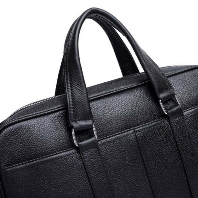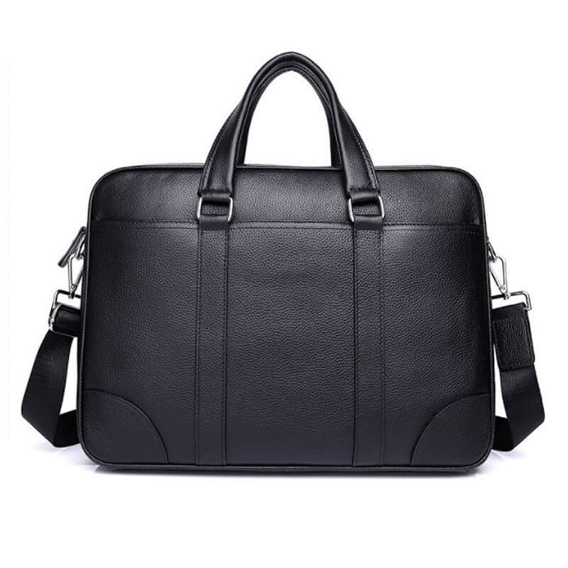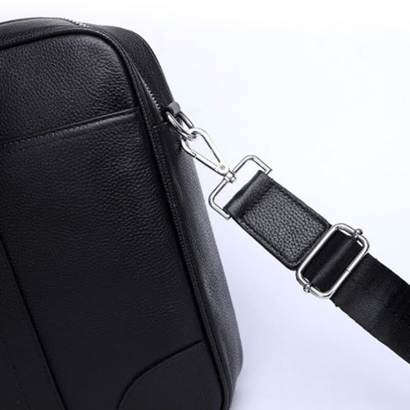 Сумка из натуральной кожи черного цвета - отличный вариант для деловых мужчин. Это идеальный вариант для работы и для деловых поездок. Имеет 1 отделение, которое закрывается на молнию. Внутри сумки - 1 карман на молнии и отдел под планшет или ноутбук. С тыльной и лицевой стороны сумки вместительные накладные карманы на кнопках. Подкладка-текстиль. Цвет фурнитуры- серебро. В комплекте- съемный плечевой ремень.