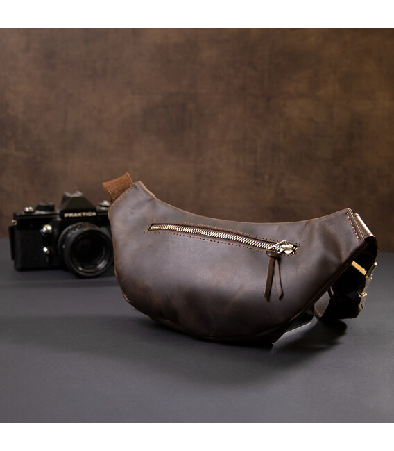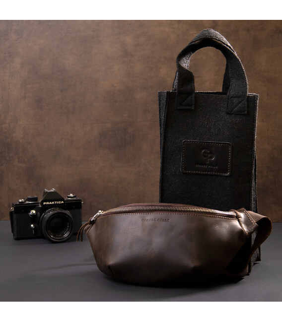 Материал: натуральная итальянская кожа; Цвет: коричневый; Размеры (ШхВхГ, см): 30х13,5х7; Страна производитель: Украина. Описание: - регулируемый ремешок на пояс; - основное отделение на молнии; - внутри карман открытого типа; - карман на молнии на тыльной стороне. Великолепная мужская бананка из натуральной кожи станет дополнением образа современного делового мужчины. Она выглядит очень современно, благодаря красиво подобранной фурнитуре цвета серебра, элегантным ровным строчкам и качественной коже, которая переливается на солнце. Сумка в винтажной коже, которая пользуется особой популярностью среди наших клиентов. Основной особенностью данного типа кожи является появление царапин и потертостей в процессе носки изделия. Именно они придают коже эффект старения, за который ее так любят. Бананка - идеальный подарок для близкого человека. Сумочка упакована в качественный фирменный войлочный чехол. Размеры сумки измерены: ширина по самой широкой точке сзади, высота - сзади, глубина - сверху.