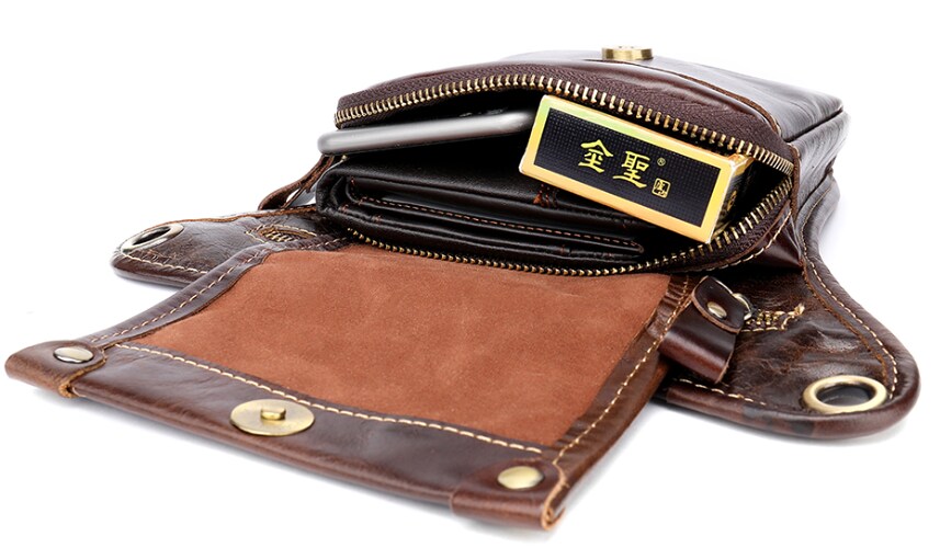 Компактная кожаная сумка, которая с легкостью сможет заменить вам барсетку. Особенностью сумки является то, что вы можете носить ее повесив на свой ремень или ногу. С такой сумочкой все будет у вас под рукой и перед глазами. Сумка, которая крепится на пояс обеспечит безопасность всем вашим личным вещам и освободит руки. Модель дополнена крепкой металлической фурнитурой серебристого цвета. Сумка будет находкой для водителей, таксистов и мужчин, которые проводят много времени за рулем. Аксессуар упакован в пылезащитный чехол.