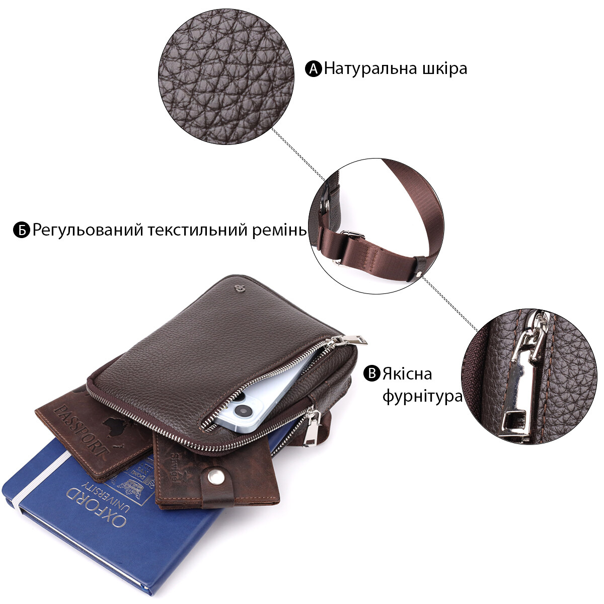 С виду — компактная сумка через плечо, но на деле она удивляет своей вместительностью и удобством. Такой аксессуар особенно незаменим в путешествиях и активных буднях, когда важно держать под рукой все самое ценное и необходимое. Модель изготовлена исключительно из натуральной итальянской кожи флотар премиального качества — материала с изысканным матовым блеском и приятной зернистой текстурой. Аксессуар дополнен надежной фурнитурой серебристого цвета, а аккуратные, ровные швы подчеркивают высокое качество исполнения. Эта сумка — универсальное и стильное решение для современного мужчины. Она органично впишется как в деловой, так и в повседневный образ, подчеркивая вашу индивидуальность, вкус и внимание к деталям. Идеальный союз практичности, комфорта и утонченного стиля.