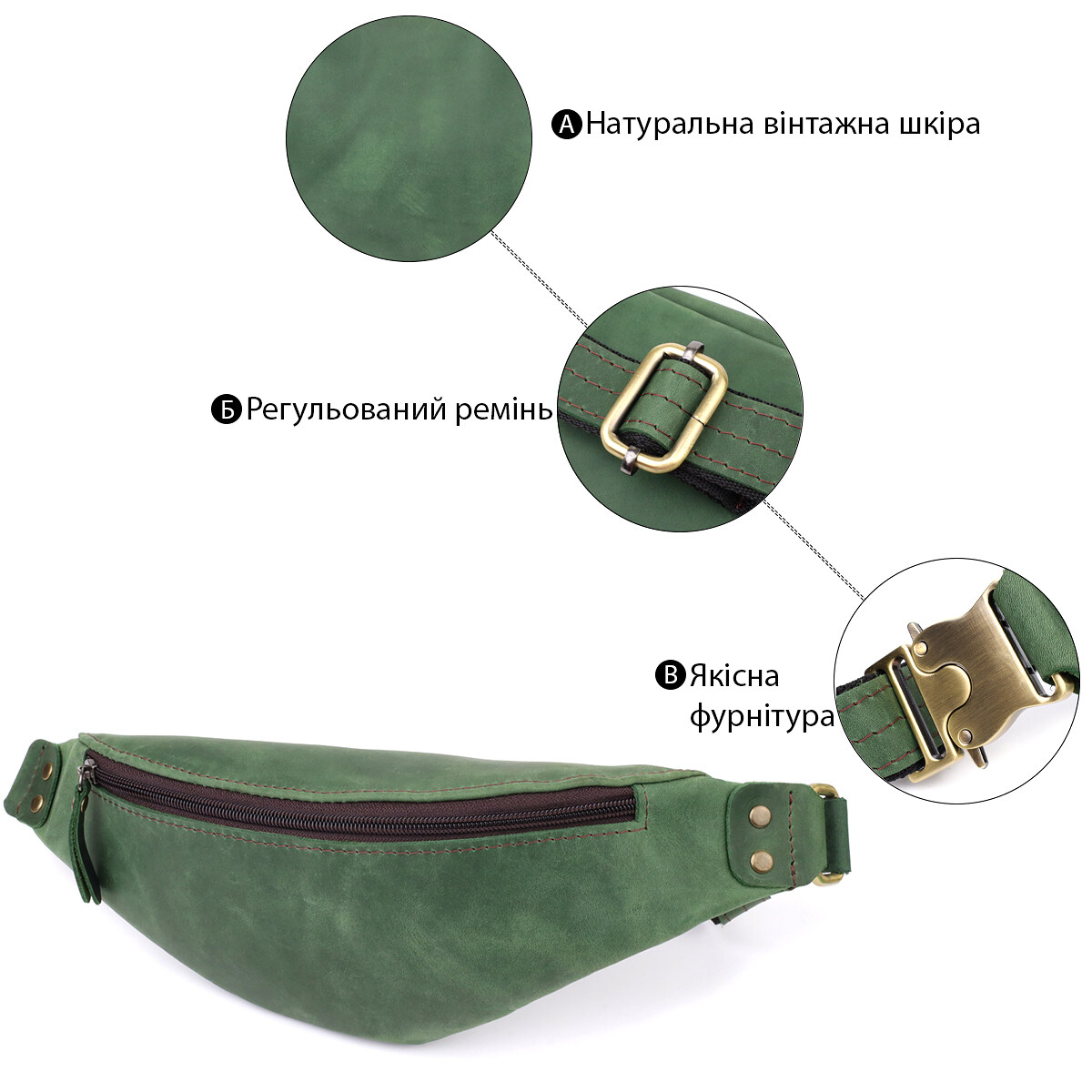 Сумка-бананка Shvigel из винтажной кожи в насыщенном зелёном цвете. Эта мужская бананка от украинского бренда Shvigel выполнена из натуральной винтажной кожи и выделяется эффектным глубоким зелёным оттенком, который подчёркивает уникальность изделия и делает образ более выразительным. Такая сумка не только удобна в повседневном использовании, но и становится стильным акцентом благодаря нестандартному цвету.