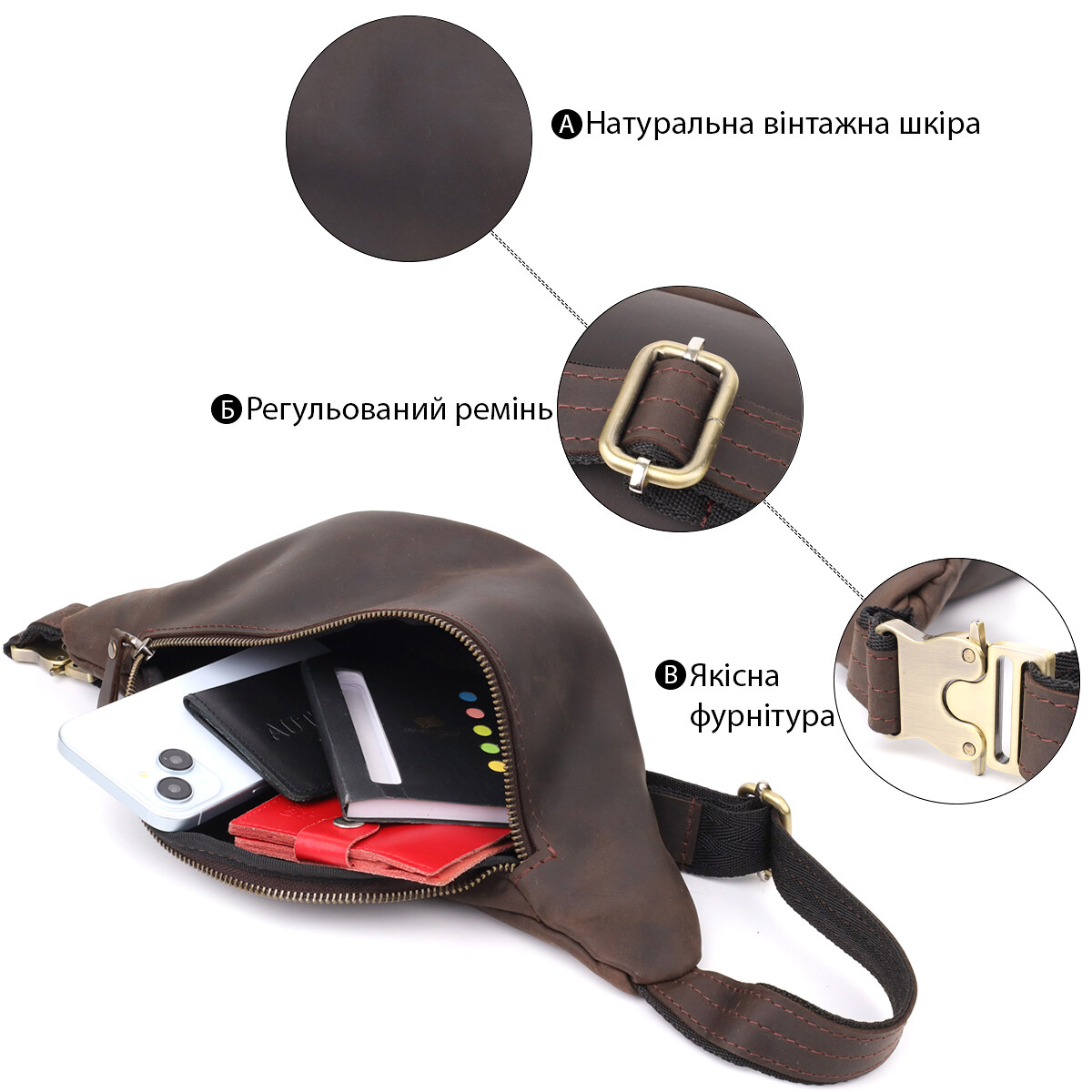 Сумка-бананка из натуральной винтажной кожи Shvigel в коричневом цвете — гармония стиля и практичности. Эта мужская сумка-бананка от украинского бренда Shvigel выполнена из высококачественной натуральной винтажной кожи и представлена в благородном коричневом цвете. Такой оттенок придаёт изделию тёплый, элегантный характер и отлично сочетается с повседневной или деловой одеждой, подчёркивая ваш вкус и уверенность в себе.