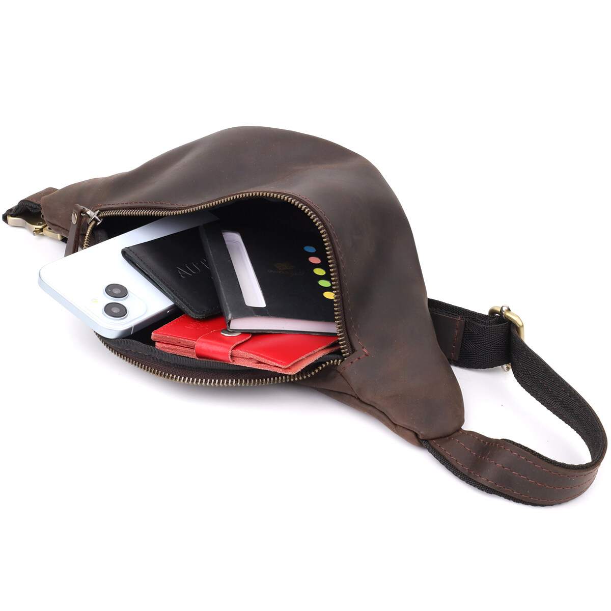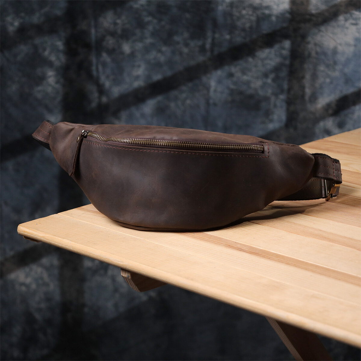Компактная, но вместительная конструкция включает основное отделение на молнии и удобный внутренний карман, в которое легко поместятся документы, кошелёк, ключи и смартфон. Регулируемый ремень из кожи и текстиля позволяет носить сумку через плечо или на поясе — как вам комфортно.