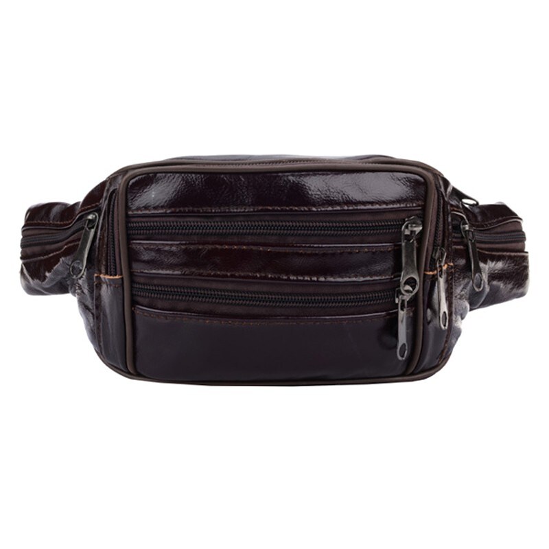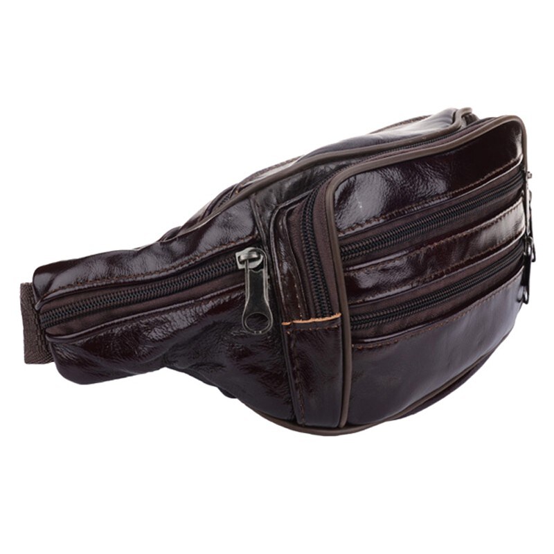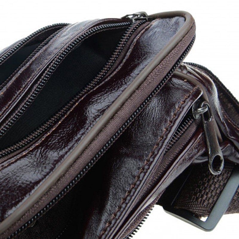 Стильная поясная сумка из натуральной кожи- отличное приобретение для практичного мужчины. Главное отделение закрывается на молнию.Сумка имеет много функциональных карманов на молнии: 2- с лицевой стороны, 2 боковых кармана и 1 карман снаружи. Длина ручки регулируется. Подкладка-текстиль. Цвет фурнитуры-серебро.