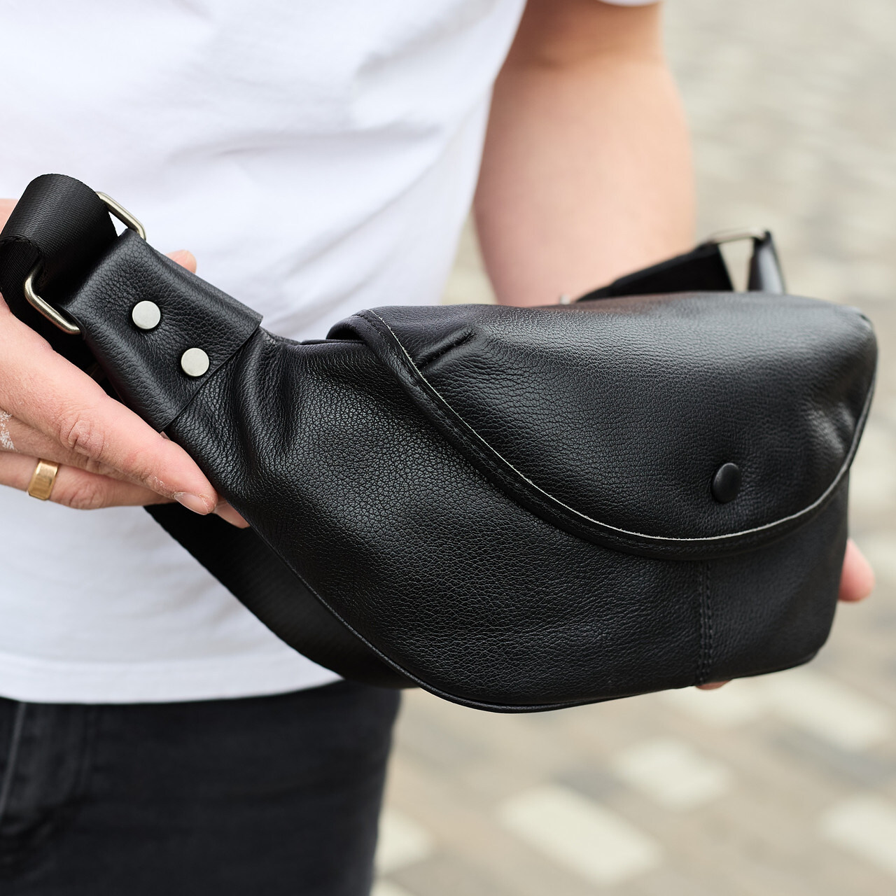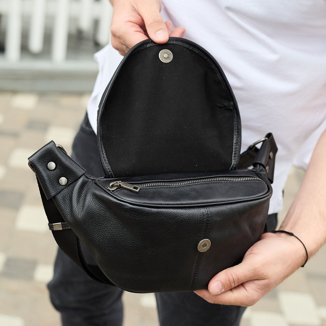 Лаконичная мужская бананка из черной натуральной кожи с фурнитурой под старую бронзу. Бананка удобно размещается на теле и позволяет незаметно носить все необходимые вещи при себе. Бананка имеет одно большое отделение на молнии, внутри которого есть боковой карман, а также дополнительный карман на молнии, с тыльной стороны. Ремешок бананка регулируемый, не съемный, имеет надежное крепление.