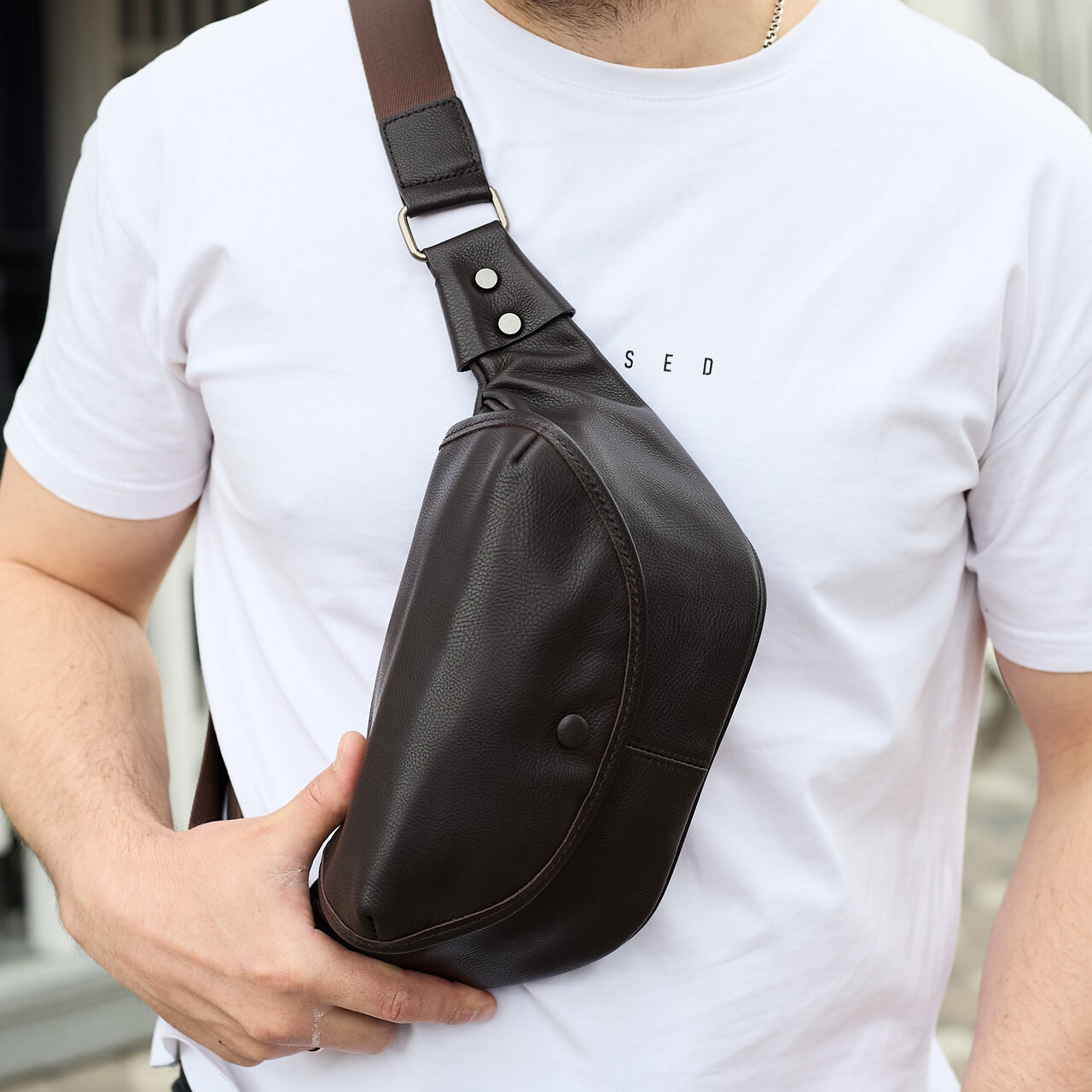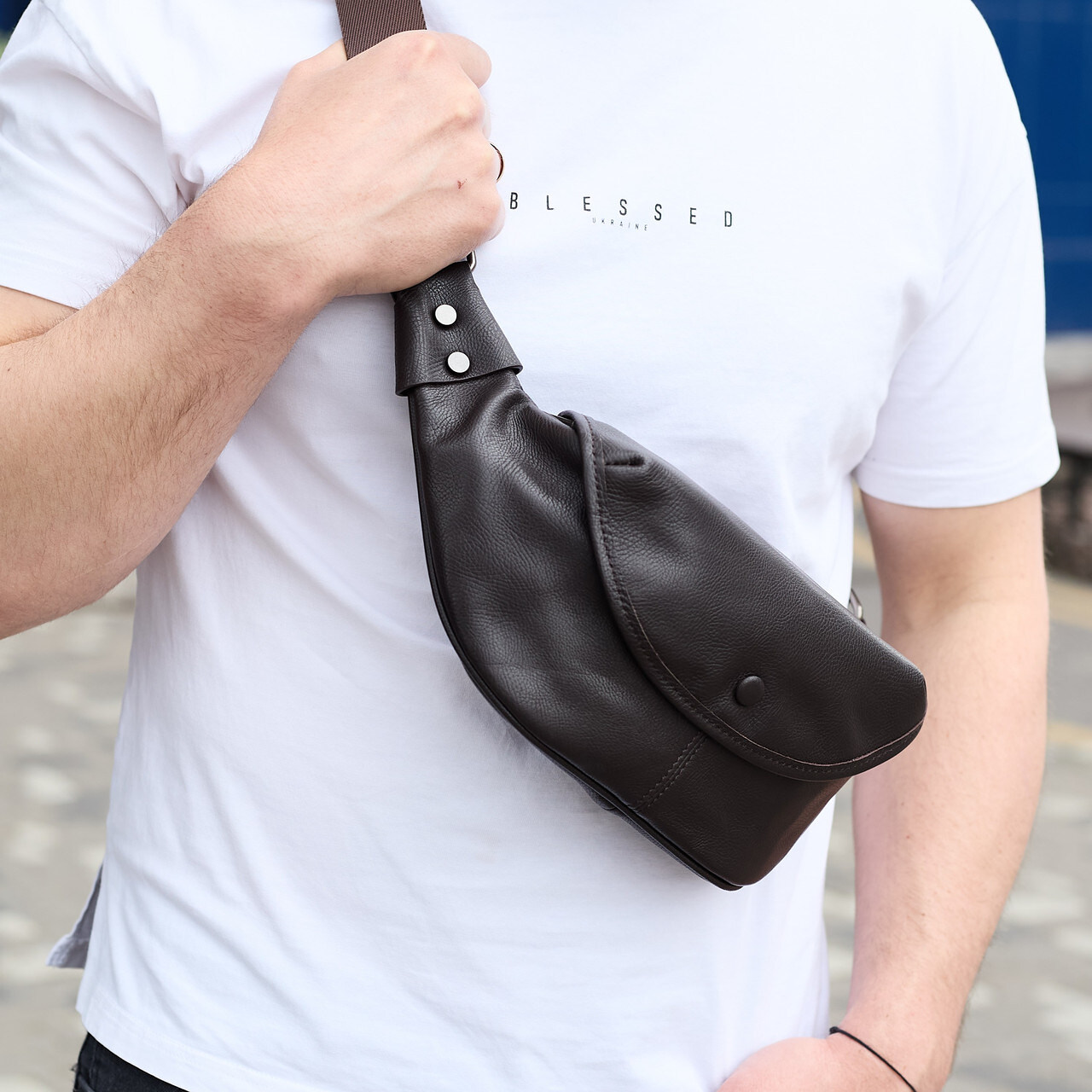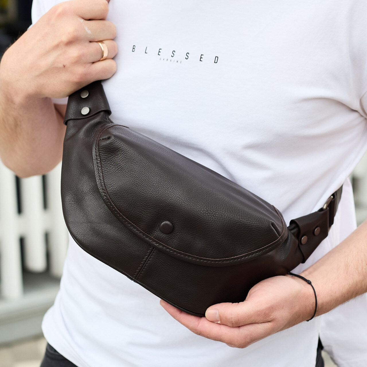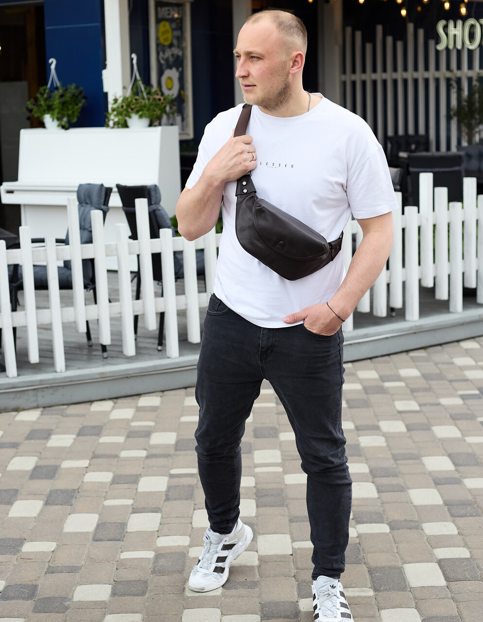 Лаконичная мужская бананка из черной натуральной кожи с фурнитурой под старую бронзу. Бананка удобно размещается на теле и позволяет незаметно носить все необходимые вещи при себе. Бананка имеет одно большое отделение на молнии, внутри которого есть боковой карман, а также дополнительный карман на молнии, с тыльной стороны. Ремешок бананка регулируемый, не съемный, имеет надежное крепление.