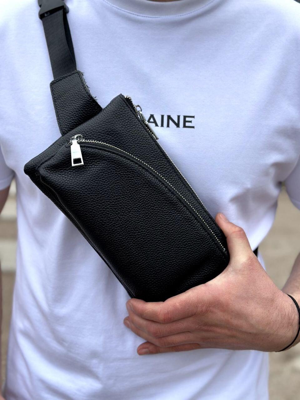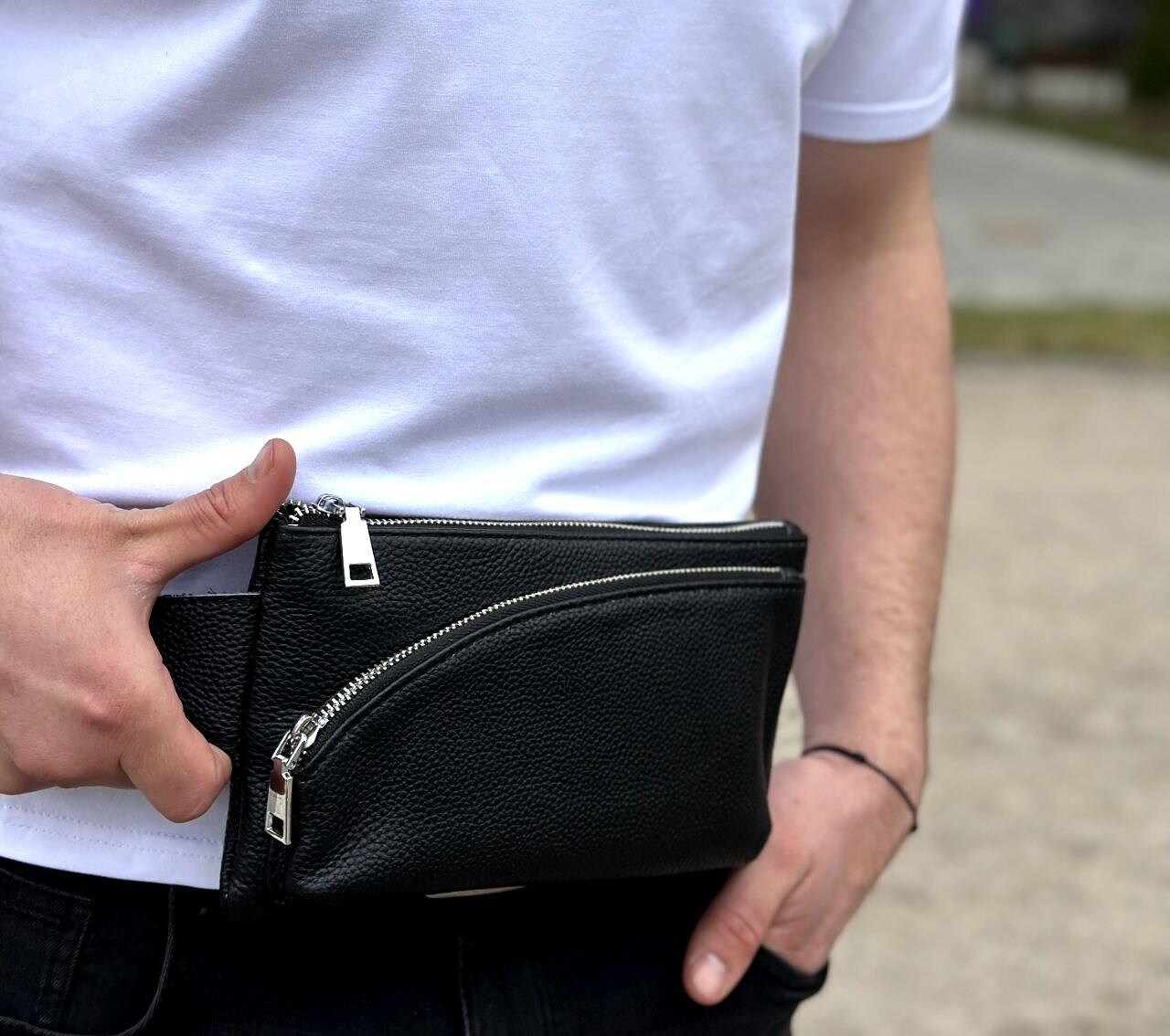 Лаконичная мужская бананка из черной натуральной кожи с фурнитурой под серебро. Бананка удобно размещается на теле и позволяет незаметно носить все необходимые вещи при себе. Бананка имеет одно большое отделение на молнии, внутри которого есть боковой карман, а также одно дополнительное отделение на молнии (с передней части бананка). Ремешок бананка регулируемый, не съемный, имеет надежное крепление.