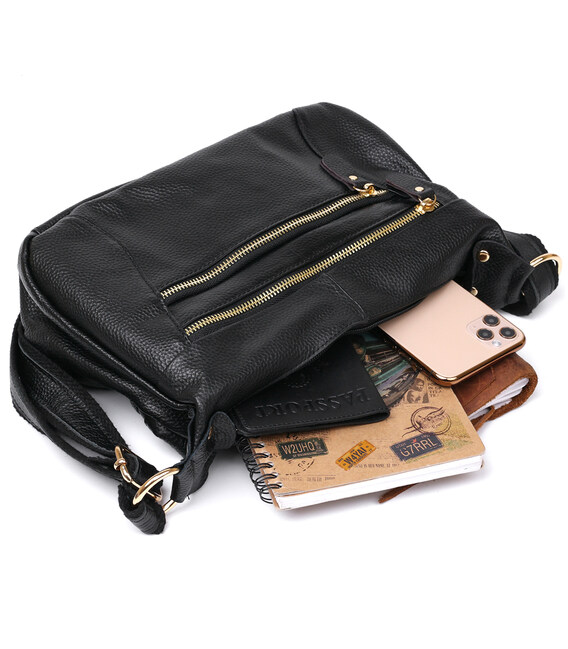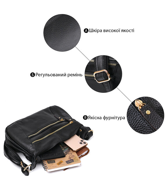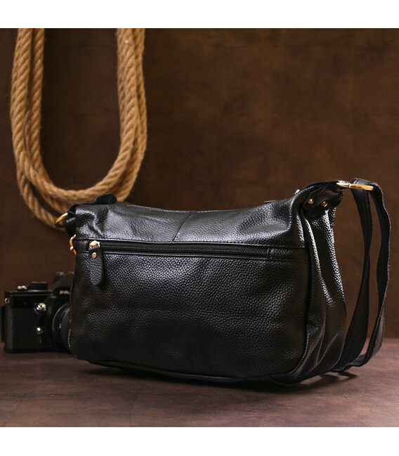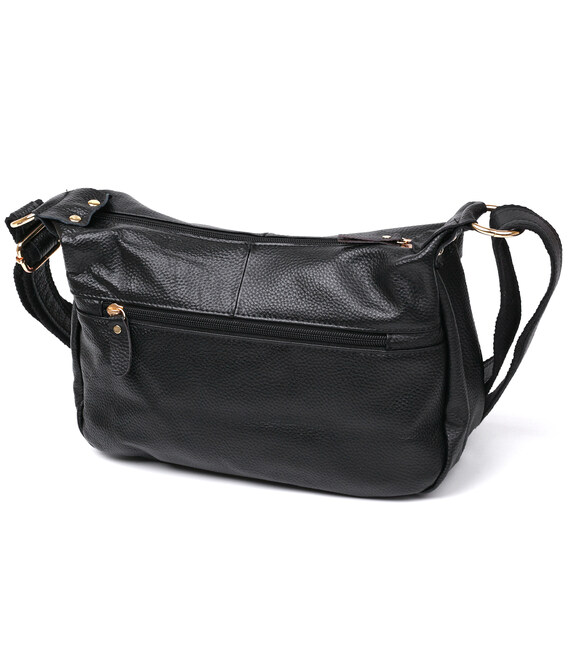 Практичная женская сумка небольшого размера из натуральной высококачественной кожи с зернистой фактурой. Имеет универсальный черный цвет и фурнитуру под золото. Внутреннее наполнение представлено в виде вместительного отделения на молнии, карманов для телефона и прочих мелких вещей. На внешней стороне также присутствуют вместительные карманы.