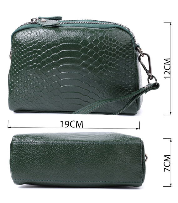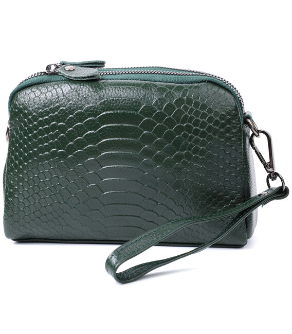 Красивая женская сумка из натуральной мягкой кожи высокого качества с тиснением под змею. Изделие очень удобное, можно носить на плече и через плечо, на кисти и просто под рукой как клатч. Модель дополнена фурнитурой цвета темного серебра. Аксессуар имеет два основных отделения в которых два кармашки - один на молнии и один открытого типа, а также карман на молнии снаружи, на тыльной стороне. Идеальный вариант для любой девушки которая ценит качество и имеет превосходный вкус.