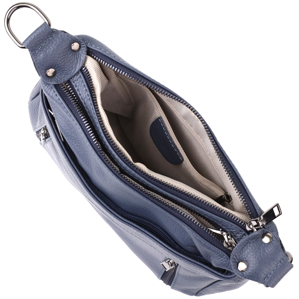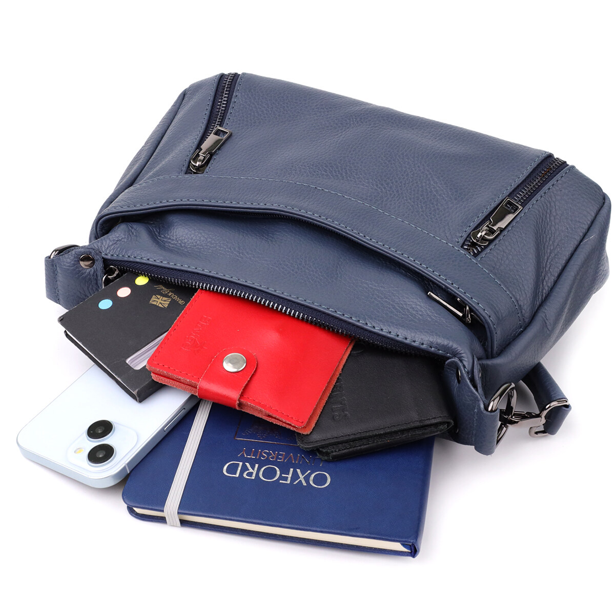 Сумка оснащена двумя основными отделениями на молниях, что позволяет удобно распределить содержимое. Внутри находятся потайной карман на молнии и два кармана открытого типа — для мелочей, телефона или ключей. На лицевой стороне предусмотрено сразу три функциональных кармана: один горизонтальный на молнии и два вертикальных — также на молниях, что придаёт модели динамичный, современный вид. На тыльной стороне — дополнительный карман на молнии для быстрого доступа к важным вещам.