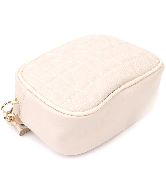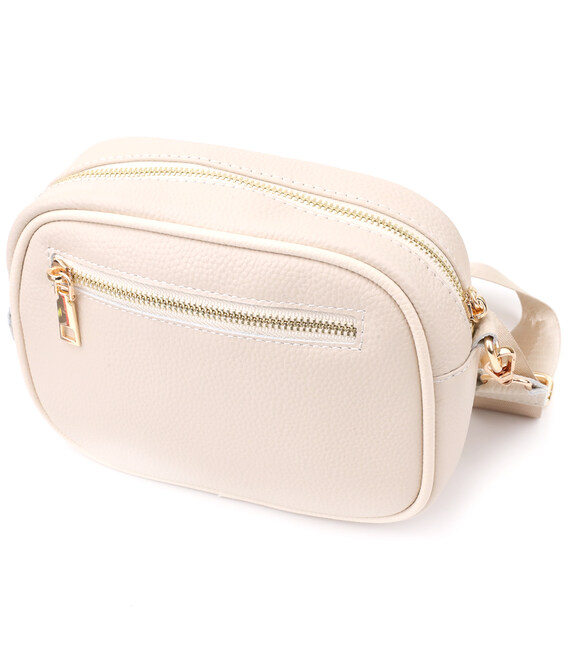 Женска сумка в нежном белом цвете из натуральной кожи станет элегантным и изысканным акцентом вашего образа. Мягкая, но плотная кожа приятна на ощупь и подчеркивает высокое качество изделия. Компактная четкая форма делает модель аккуратной и удобной, а стежка на лицевой стороне добавляет утонченный дизайнерский характер. Сумка закрывается на молнию, внутри расположено основное отделение с карманом на молнии и открытым карманом для мелочей, а на тыльной стороне есть внешний карман на молнии для быстрого доступа к нужным вещам. Съемный регулируемый текстильный ремень обеспечивает комфорт при носке, а фурнитура под желтое золото гармонично оттеняет светлый белый тон кожи. Эта сумка станет универсальным аксессуаром для повседневных выходов и особых случаев, подчеркивая утонченный вкус и любовь к качественным материалам.