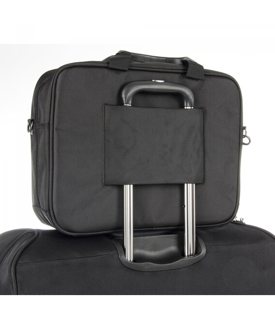 На задней поверхности портфеля предусмотрена текстильная планка для фиксации на телескопической ручке чемодана.