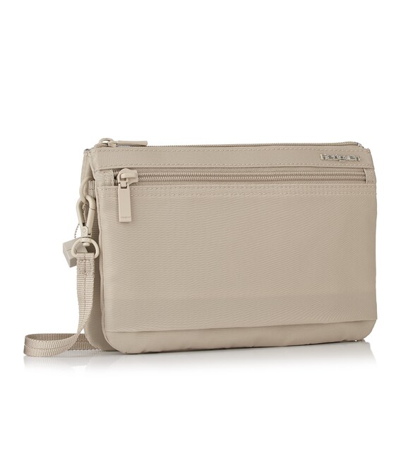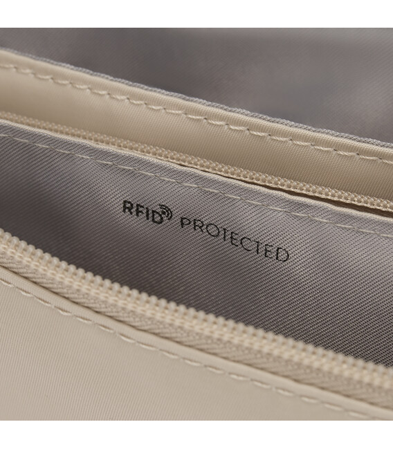 Удобная женская сумка через плечо, маленького размера изготовлена из прочной ткани с съемным ремнем, позволяющим регулировать длину. У изделия есть три отделения на молнии, в одном из которых есть слоты для карт и RFID-защита, карман для документов, телефона и мелочей. На фасадной части расположен карман на молнии.