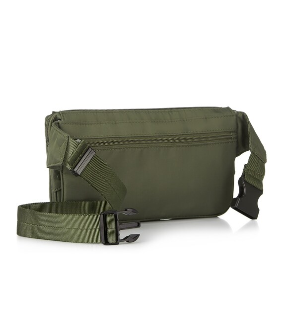 Поясная сумка из прочной ткани, оснащена ремнем с возможностью регулировки длины. У изделия одно основное отделение, которое оснащено дополнительным, внутренним карманом. На фасадной части расположен карман на молнии. На задней части расположен карман с RFID-защитой от мошенничества. Изделие декорировано брелоком с названием бренда.