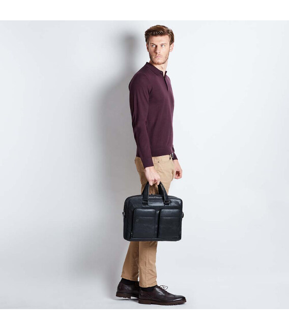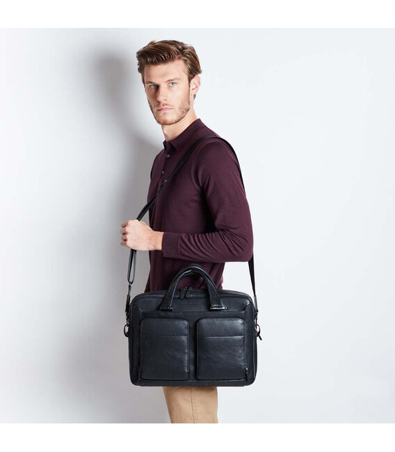 C умка Piquadro Black Square/Black CA2849B3_N Страна бренда – Италия. 2 года гарантии.Черный цвет – Black/ CA2849B3/N. Материал – натуральная кожа.Размер: 39,5x28x10 см. Вес – 1,2 кг.Два фронтальных кармана с накладными передними карманами.Одно вместительное отделение с противоударными отсеками для ноутбука 15,6 дюймов и iPad Air/Pro.Внутри есть органайзер с карманами для кредитных карт, различными карманами открытого типа, держателями для ручек и брелоком для ключей.Два фронтальных карманам с внешними кармашками и карманами внутри.Сзади есть карман на молнии.Фирменный трекер Connequ предназначен для отслеживания сумки в случае ее потери.Для фиксации сумки на телескопической ручке чемодана сзади нашит ремень.Для переноса сумки есть две мягкие ручки и ремень для ношения на плече.Piquadro Пиквадро Black Square (B3) – линейка из натуральной кожи с черной линией.Портфели, сумки, клатчи, рюкзаки и аксессуары серии B3 изготовлены из цельнозернистой тосканской кожи теленка. Ее естественная, шероховатая текстура - результат аутентичного, процесса обработки вручную, позволяющего сохранить утонченность и роскошь натуральной кожи. После кожа помещается в большие емкости с водой без добавления химических веществ. Кожа подвергается процессу сушки и раскладывается для отдыха. Благодаря огромному опыту мастеров кожевенного дела, материал получает те различия в оттенках цвета, текстуре и мягкости, они делают модельный ряд B3 уникальным и обворожительными.Деловые кожаные сумки Piquadro 100% оригинал в магазине Chemodanoff!