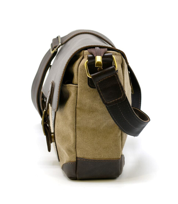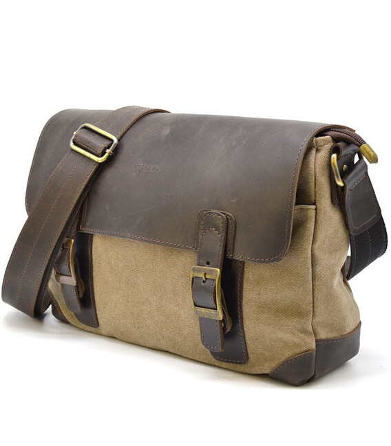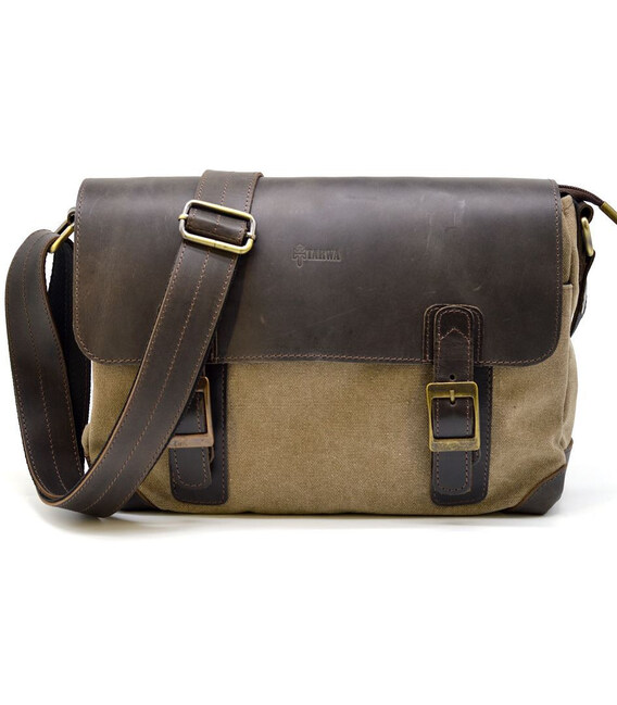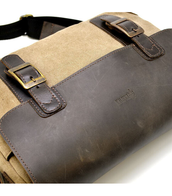 Чоловіча сумка через плече зі шкіри та тканини кинувся (холщевка, парусина), виробник - український бренд TARWA. Сумка середнього розміру з шкіряним клпапаном з двома хлястиками. 33 * 22 * 8 см