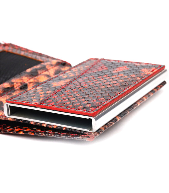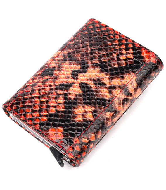 Яркий картхолдер из лакированной кожи, с тиснением под змею, предназначен для хранения банковских и дисконтных карт и небольшого количества наличных. Имеет лаконичный дизайн, отлично ложится в руку, помещается в карман, а также в любую сумку. Кожа мягкая, приятная на ощупь. Механизм работает надежно и удобен в использовании; карточки хорошо закреплены в аксессуаре. Отличная идея для подарка близкому человеку.