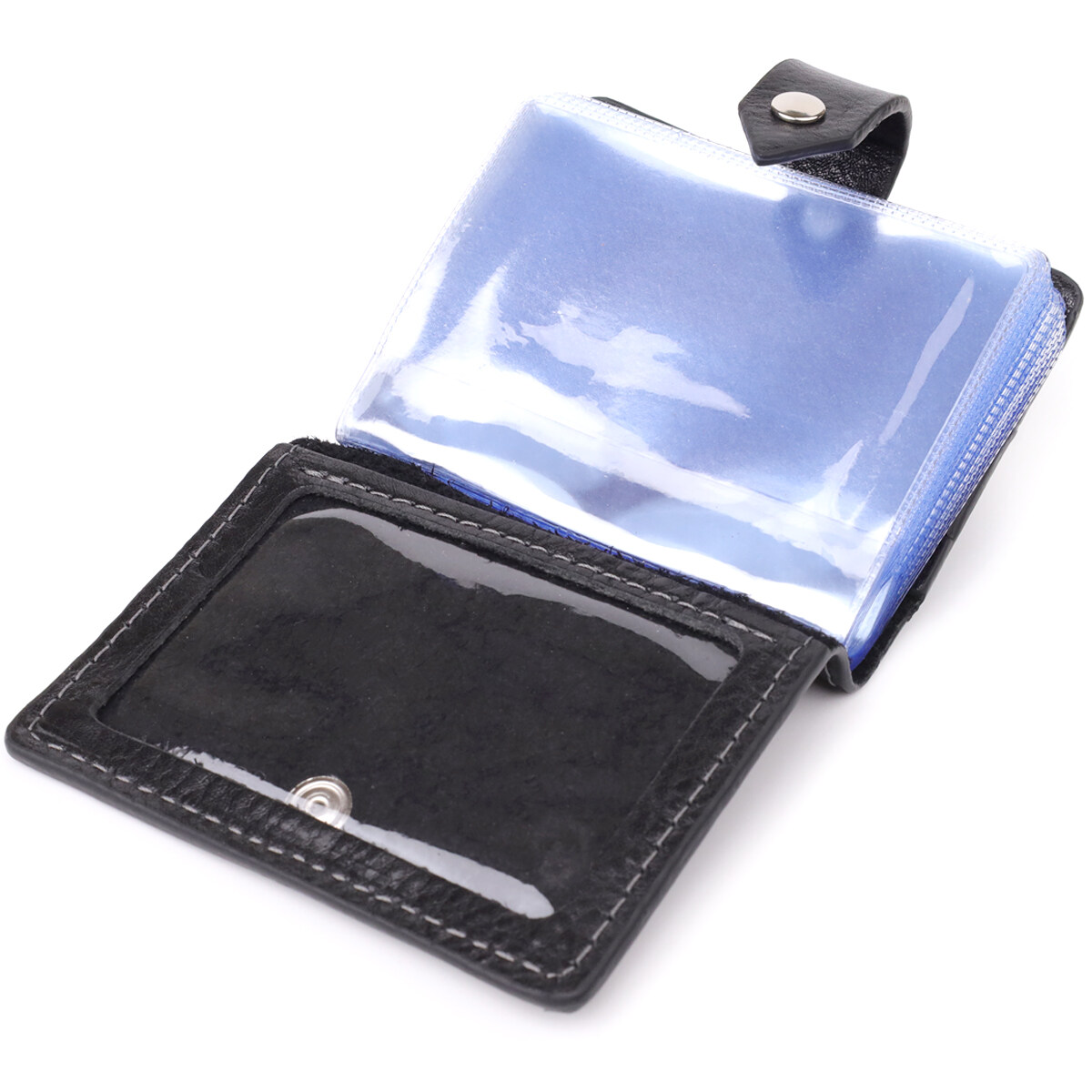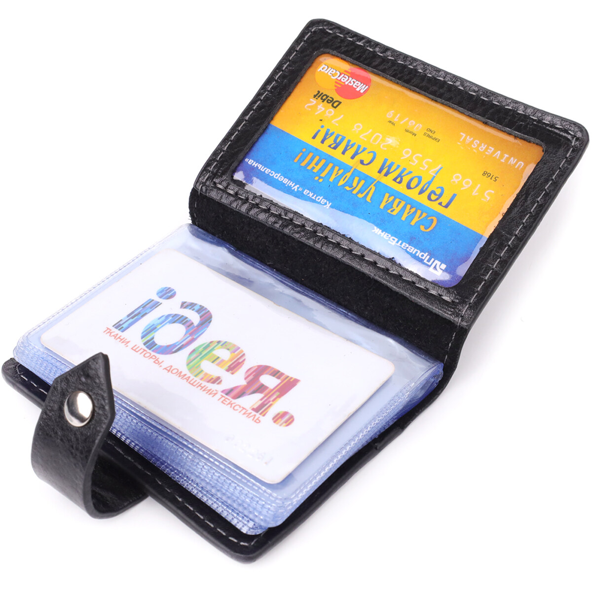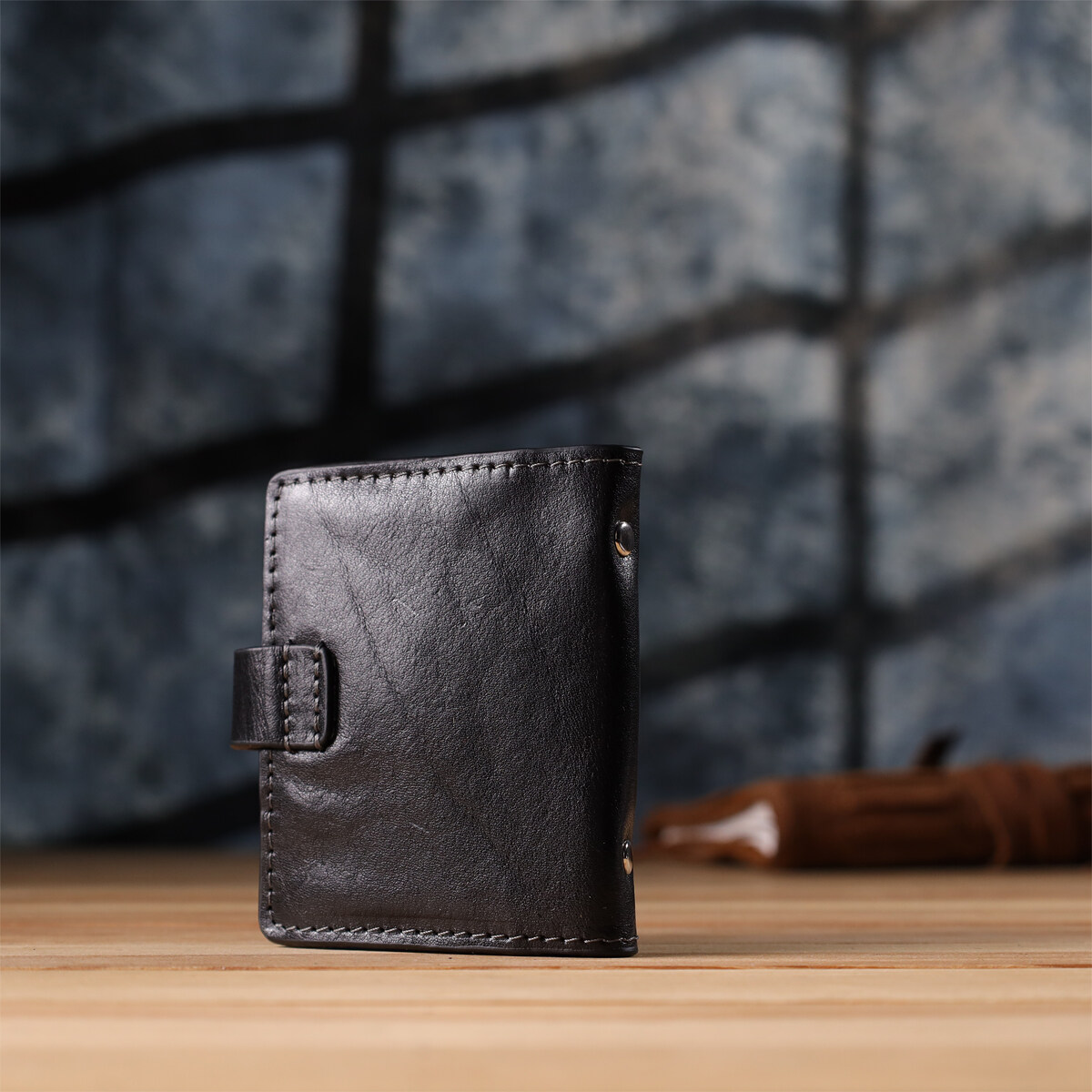 Практичная небольшая визитница из высококачественной натуральной кожи. Имеет универсальный черный цвет. Закрывается изделие на хлястик с кнопкой, что очень удобно во время использования, так как карты легкодоступны и надежно защищены. Такой презент станет отличным знаком внимания для дорогого Вам человека.