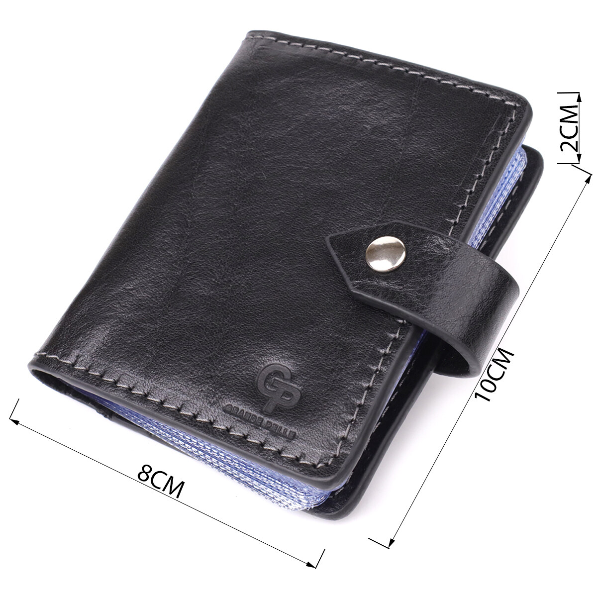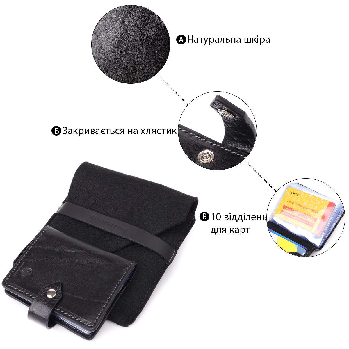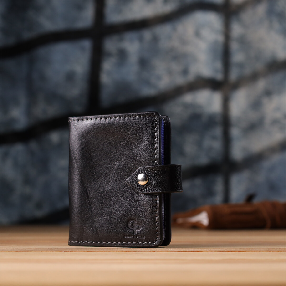 Практичная небольшая визитница из высококачественной натуральной кожи. Имеет универсальный черный цвет. Закрывается изделие на хлястик с кнопкой, что очень удобно во время использования, так как карты легкодоступны и надежно защищены. Такой презент станет отличным знаком внимания для дорогого Вам человека.