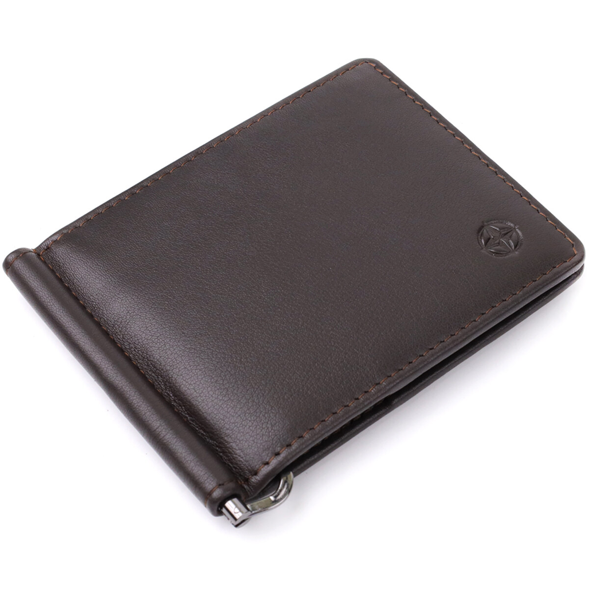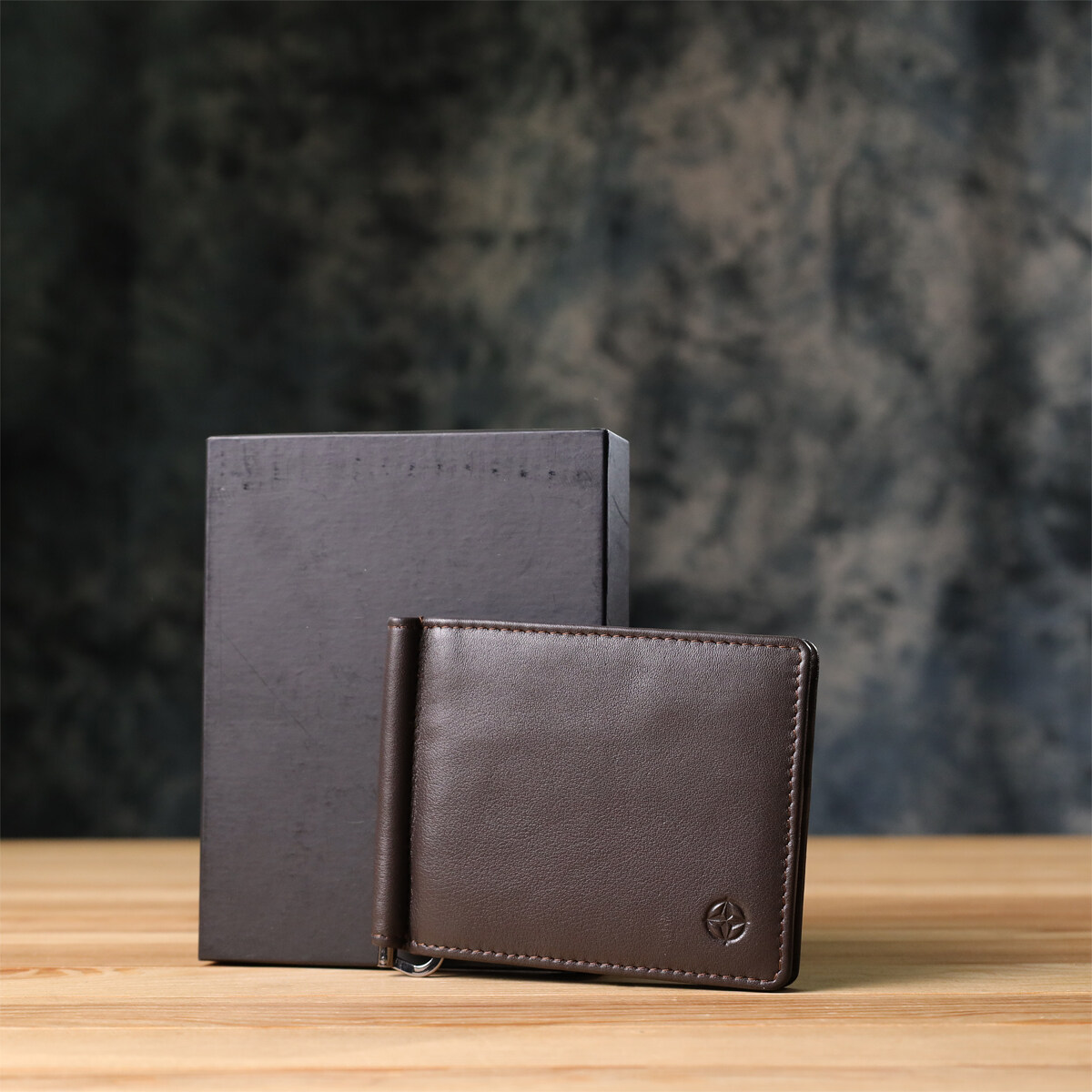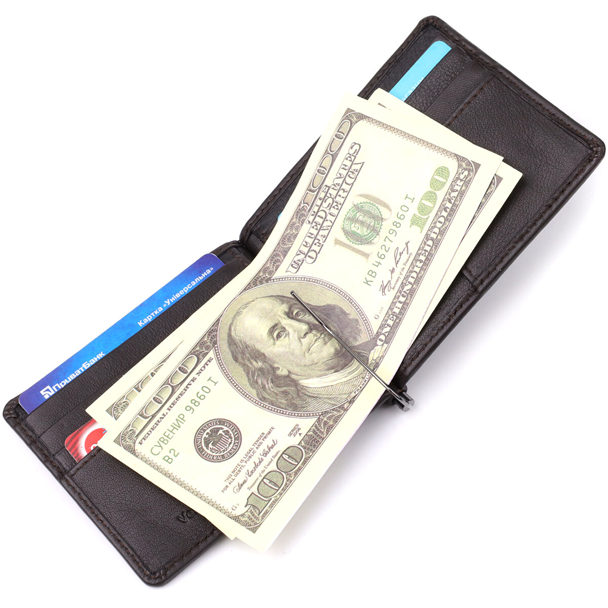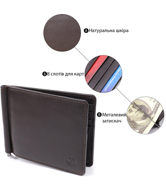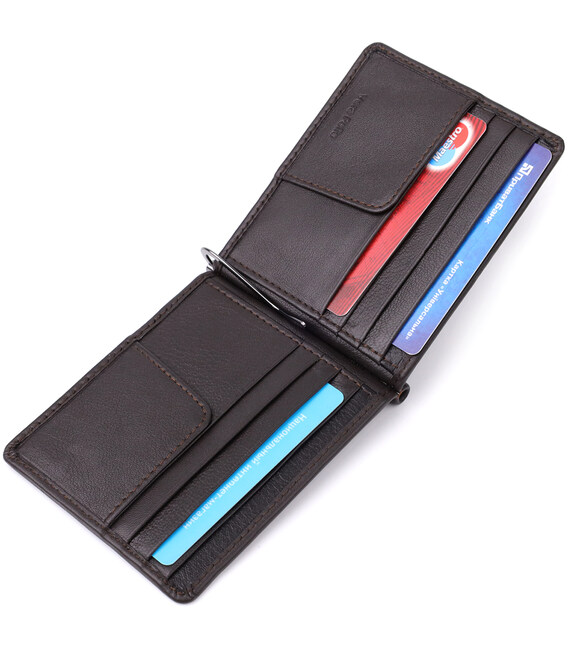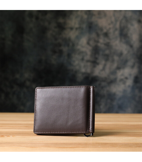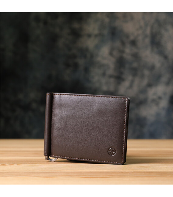 Аксессуар выполнен из натуральной гладкой кожи коричневого цвета. Внутри предусмотрены восемь слотов для карт и надежный металлический зажим для денег. На лицевой стороне в нижнем правом углу расположен тисненый логотип производителя, подчеркивающий оригинальность и статус изделия. Дизайн без застежки делает модель удобной в использовании и сохраняет компактность.