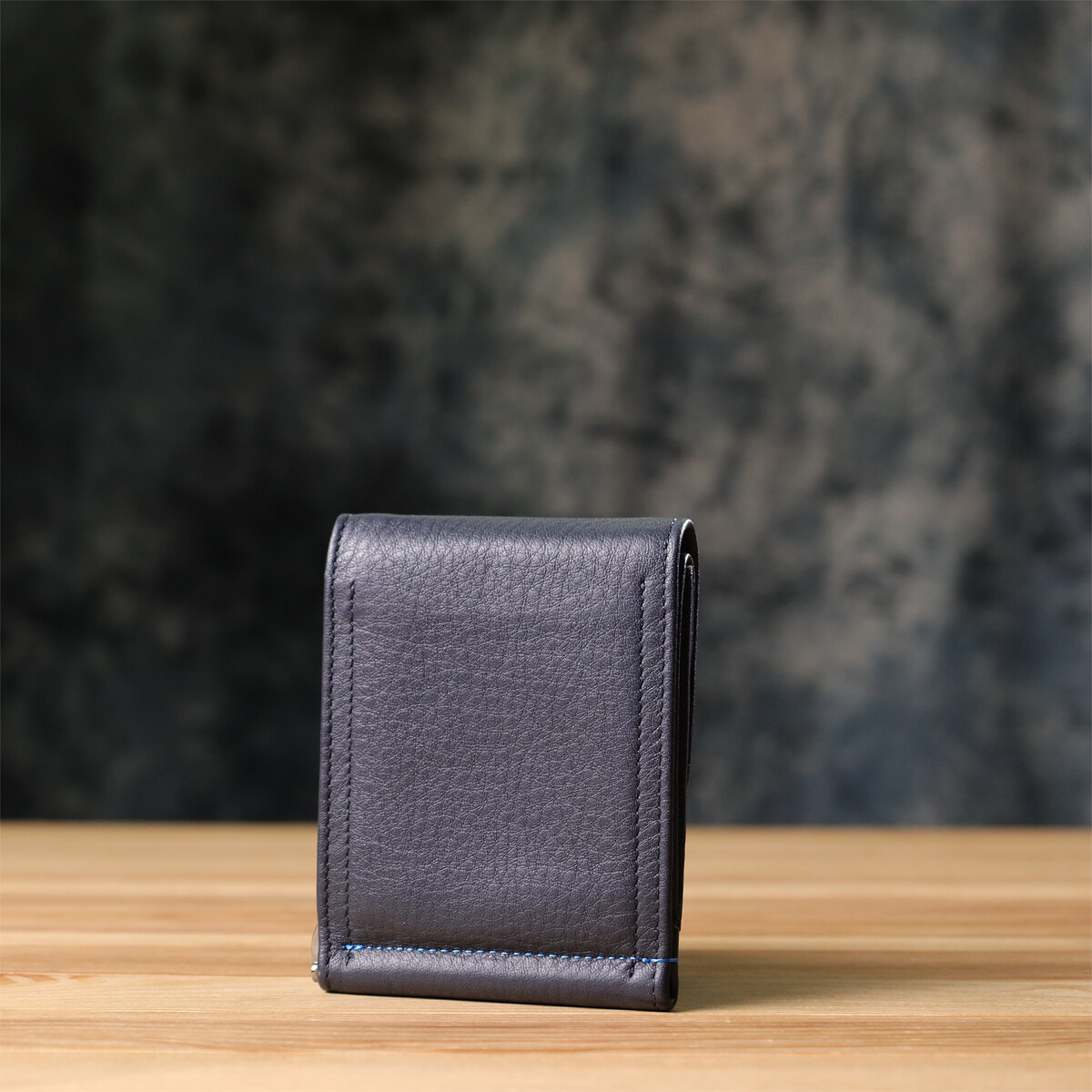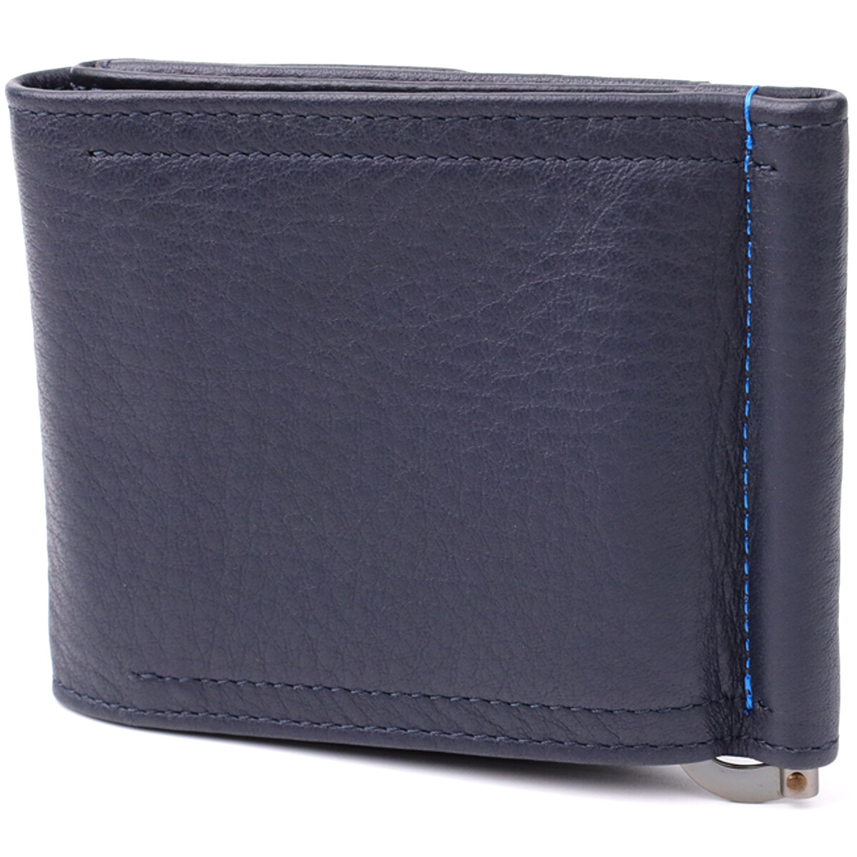 Стильный зажим для денег из зернистой натуральной кожи синего цвета — это сочетание минимализма и функциональности. Компактная форма, продуманные отделения для карт и надежный металлический зажим обеспечивают удобное хранение. Контрастная прошивка и металлический логотип бренда придают аксессуару современный и элегантный вид, подчеркивая вкус и статус владельца.