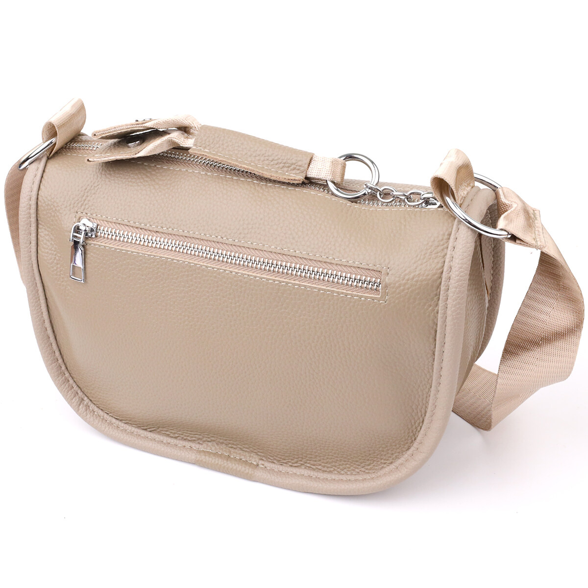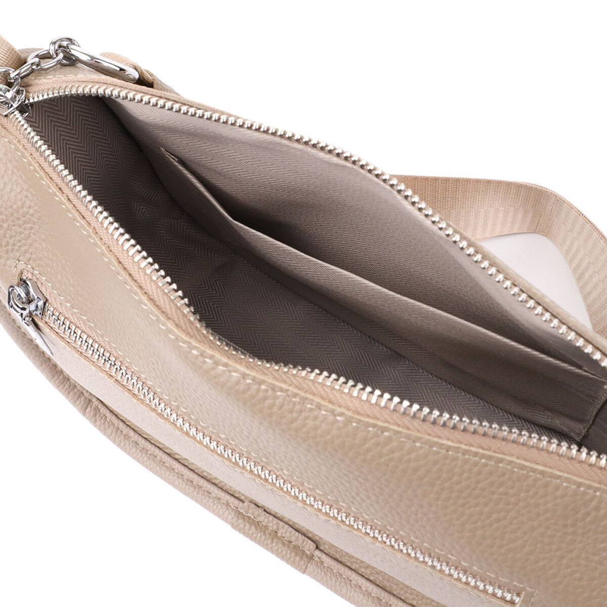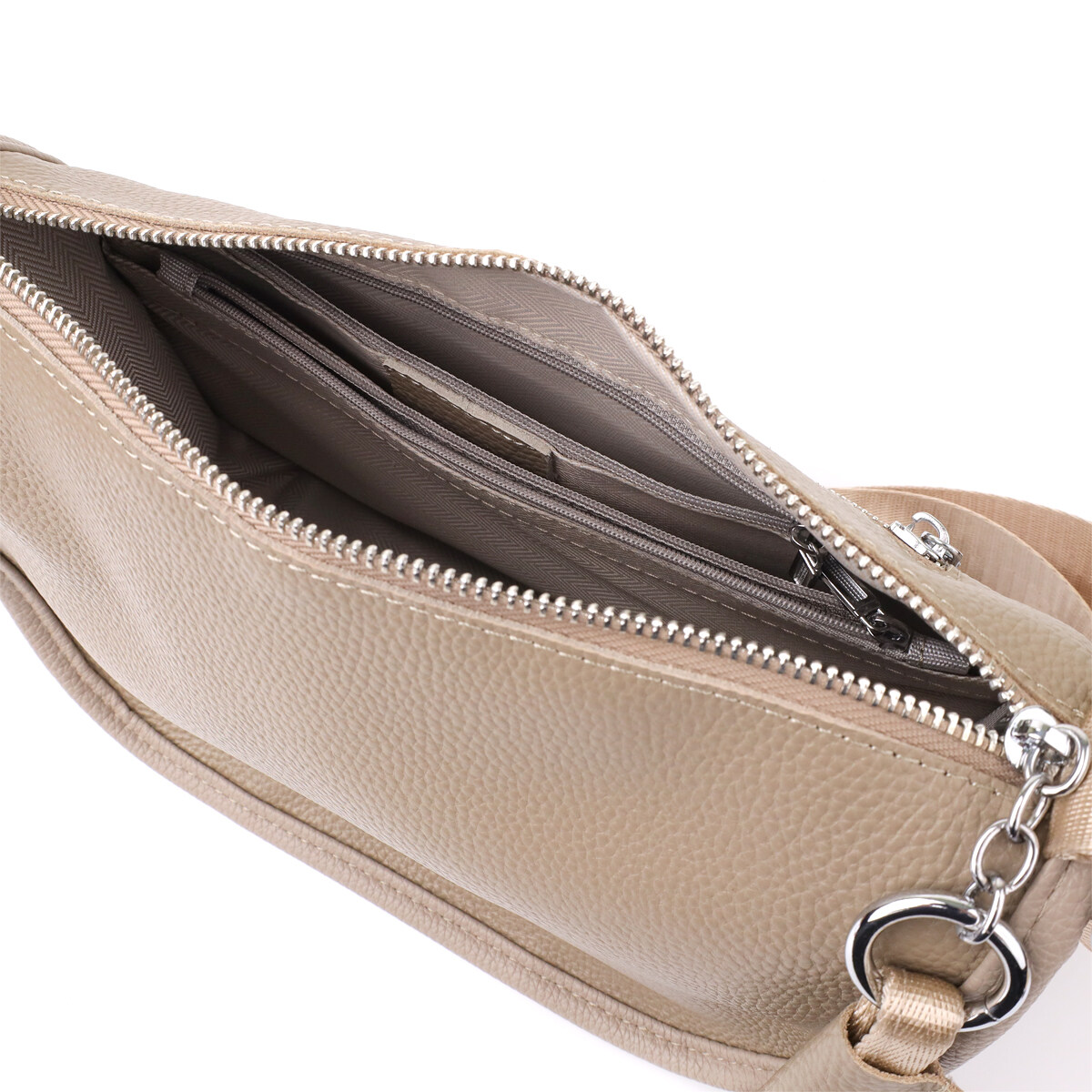 Женская кожаная сумка в бежевом цвете выполнена из качественной зернистой кожи и имеет полукруглую аккуратную форму, которая подчеркивает утонченность и современный стиль. Особое внимание привлекает декоративный бегунок в виде элегантного брелка, придающий модели индивидуальность и шарм. Сумка закрывается на молнию, внутри расположено основное отделение с двумя карманами на молнии и двумя открытыми карманами для мелких предметов, а на тыльной стороне есть внешний карман на молнии. Несъемный текстильный ремень обеспечивает удобство при носке, а фурнитура под серебро гармонично оттеняет теплый бежевый цвет кожи. Эта сумка станет стильным и практичным аксессуаром как для повседневных образов, так и для особых случаев.