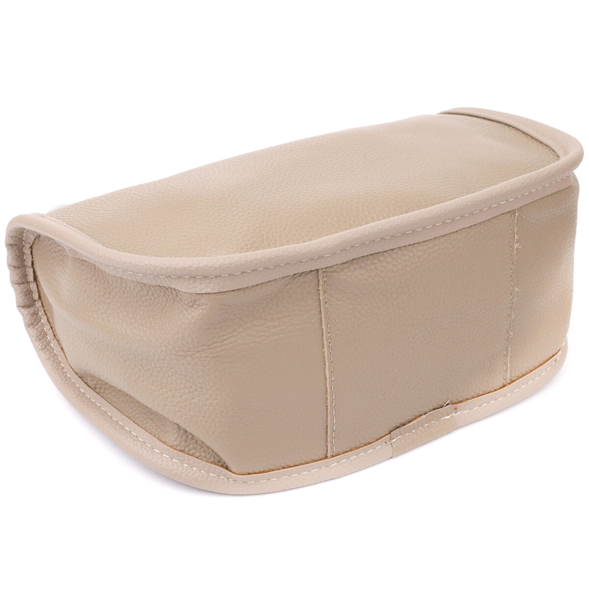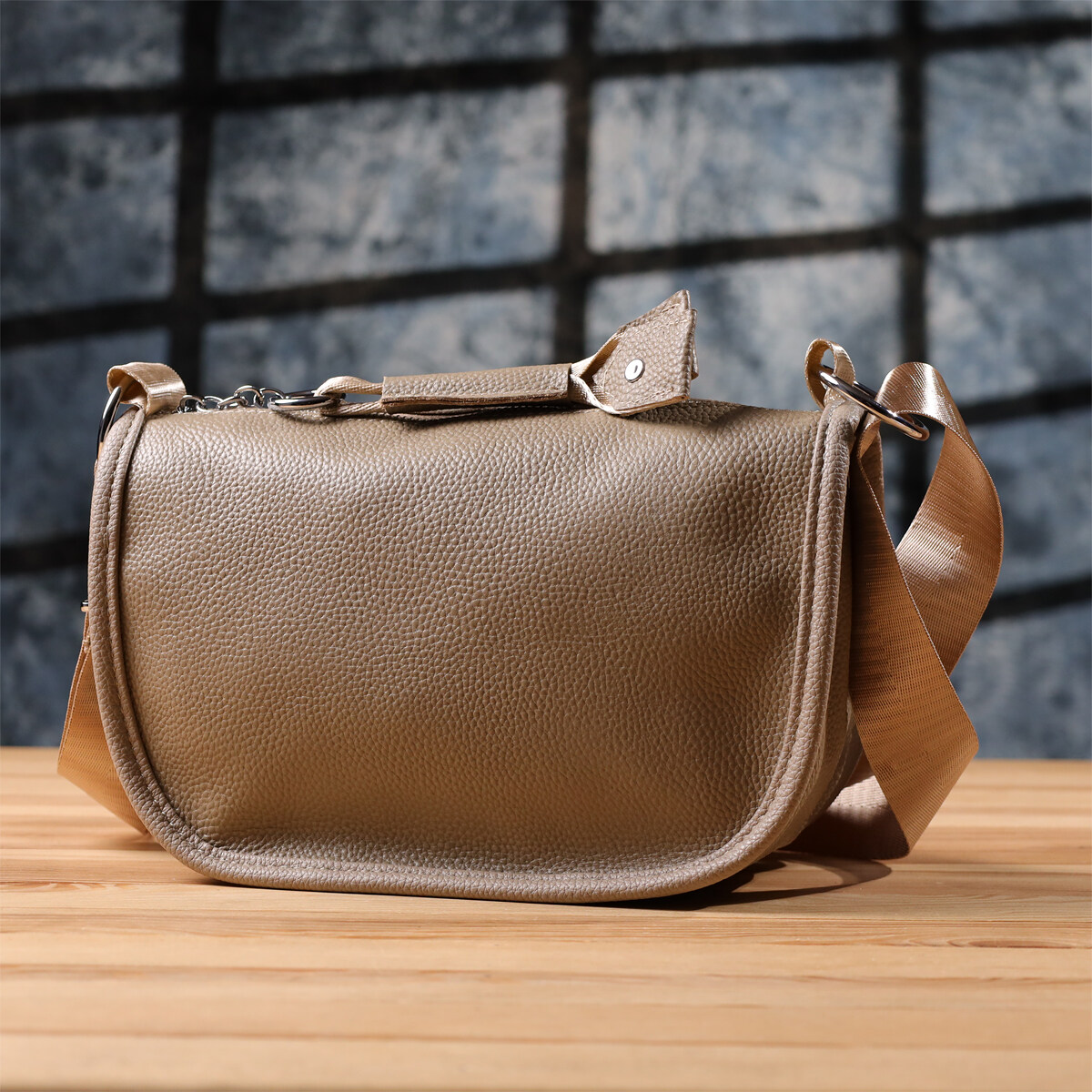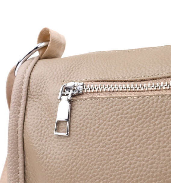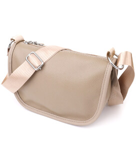 Женская кожаная сумка в бежевом цвете выполнена из качественной зернистой кожи и имеет полукруглую аккуратную форму, которая подчеркивает утонченность и современный стиль. Особое внимание привлекает декоративный бегунок в виде элегантного брелка, придающий модели индивидуальность и шарм. Сумка закрывается на молнию, внутри расположено основное отделение с двумя карманами на молнии и двумя открытыми карманами для мелких предметов, а на тыльной стороне есть внешний карман на молнии. Несъемный текстильный ремень обеспечивает удобство при носке, а фурнитура под серебро гармонично оттеняет теплый бежевый цвет кожи. Эта сумка станет стильным и практичным аксессуаром как для повседневных образов, так и для особых случаев.