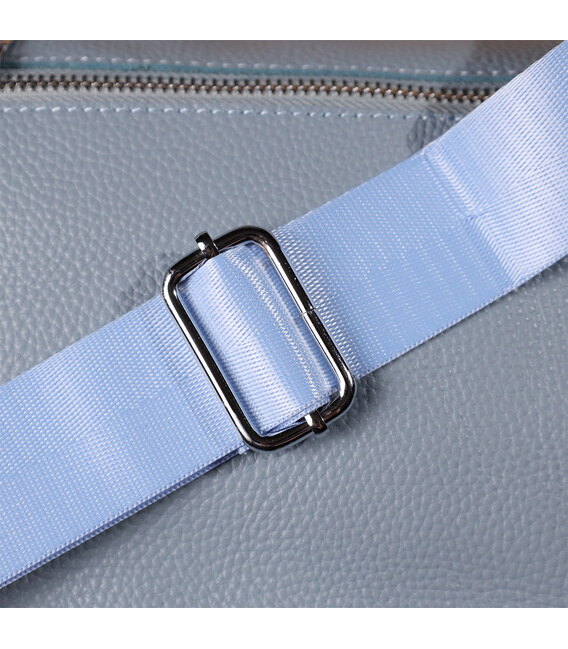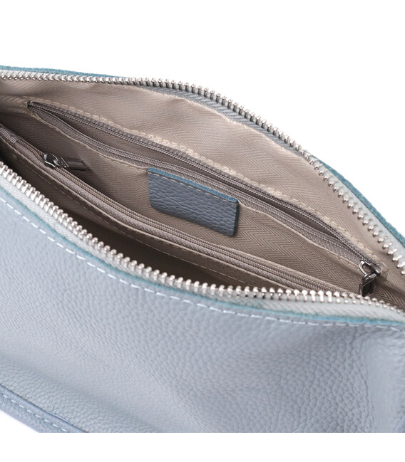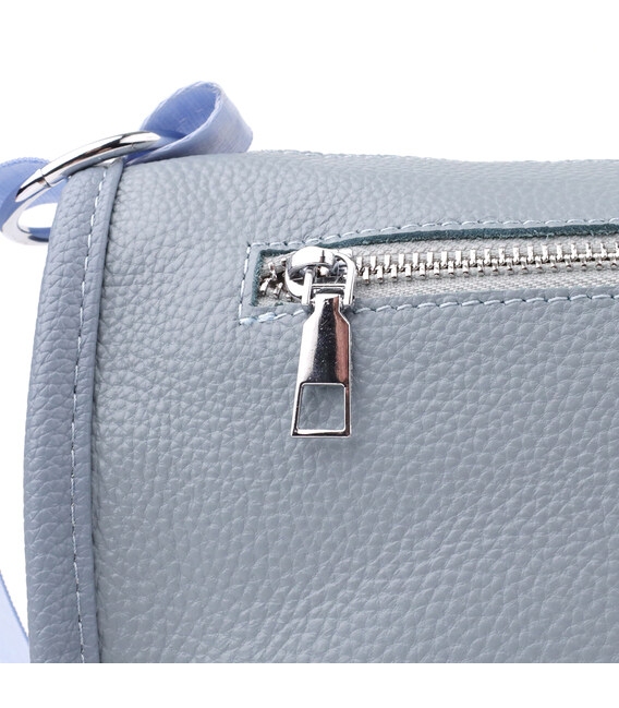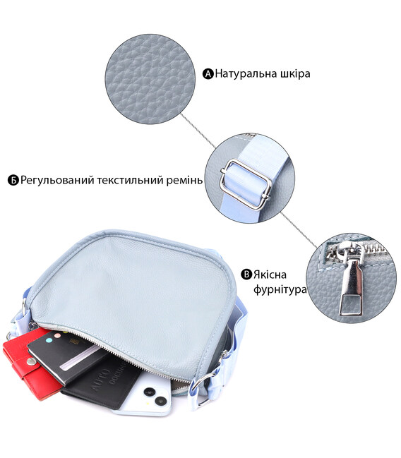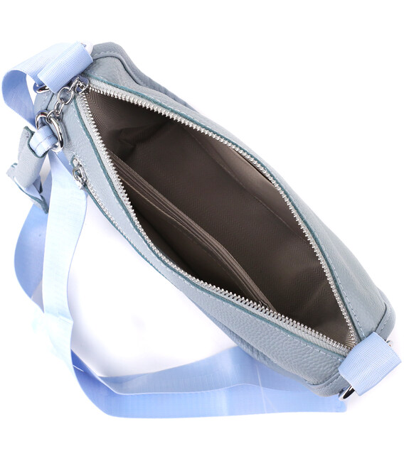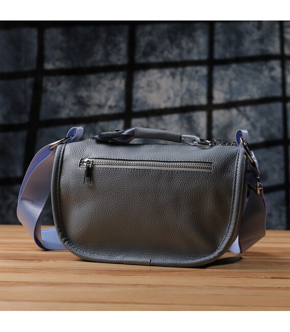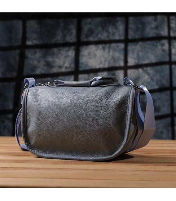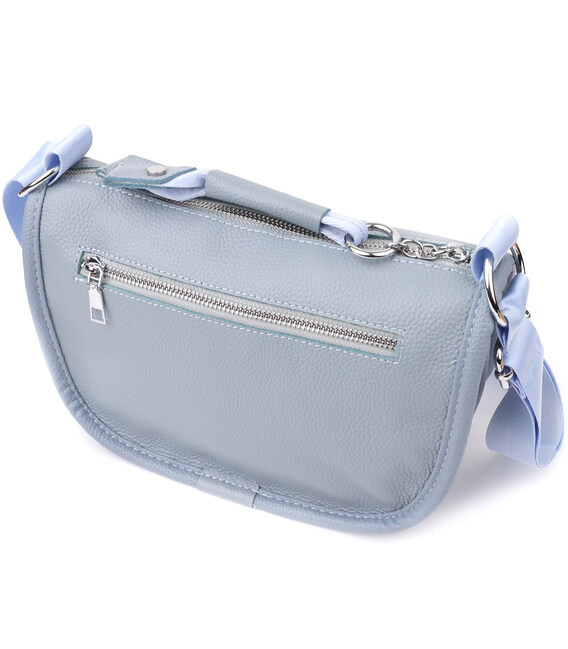 Женская кожаная сумка в серо-голубом цвете выполнена из качественной зернистой кожи и имеет полукруглую аккуратную форму, подчеркивающую современный и элегантный стиль. Особый акцент модели — декоративный бегунок в виде стильного брелка, который добавляет индивидуальности и изысканности. Сумка закрывается на молнию, внутри расположено основное отделение с двумя карманами на молнии и двумя открытыми карманами для мелочей, на тыльной стороне есть внешний карман на молнии. Несъемный текстильный ремень обеспечивает комфортное ношение, а фурнитура под серебро гармонично оттеняет холодный серо-голубой тон кожи. Эта сумка станет универсальным аксессуаром для повседневного использования и особых случаев, сочетая практичность и стиль.