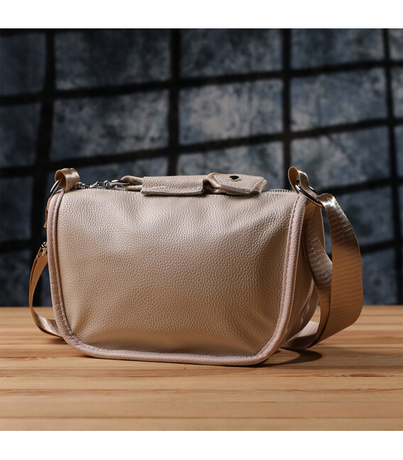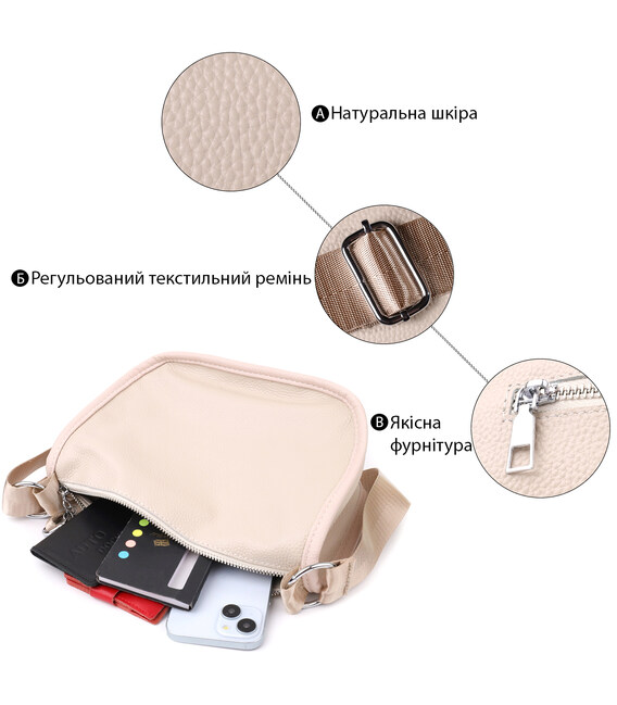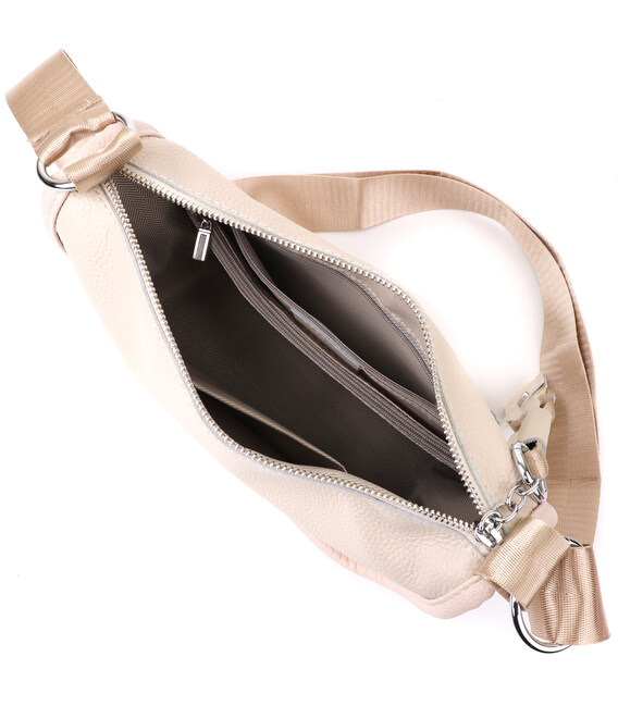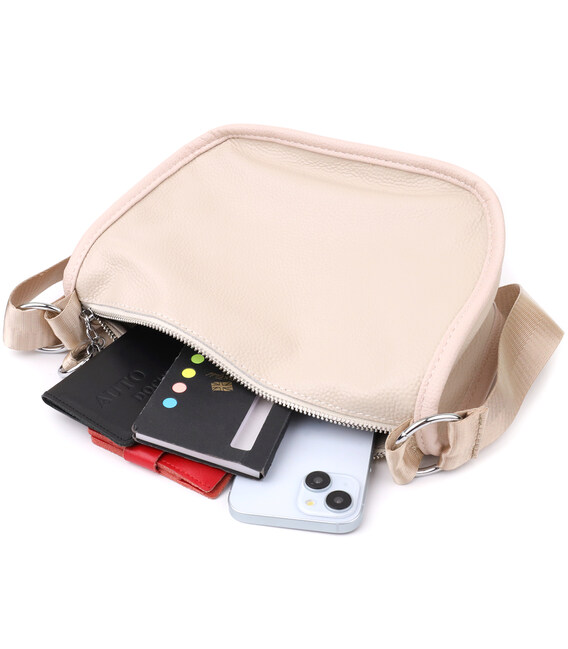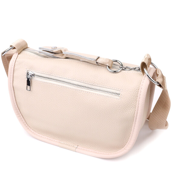 Женская кожаная сумка в нежном белом цвете выполнена из качественной зернистой кожи и имеет полукруглую аккуратную форму, подчеркивающую элегантность и легкость образа. Декоративный бегунок в виде стильного брелка придает модели индивидуальность и утонченный шарм. Сумка закрывается на молнию, внутри расположено основное отделение с двумя карманами на молнии и двумя открытыми карманами для мелочей, на тыльной стороне есть внешний карман на молнии. Несъемный текстильный ремень обеспечивает удобство при носке, а фурнитура под серебро гармонично оттеняет светлый белый тон кожи. Эта сумка станет универсальным аксессуаром как для повседневных выходов, так и для особых случаев, сочетая практичность, стиль и внимание к деталям.
