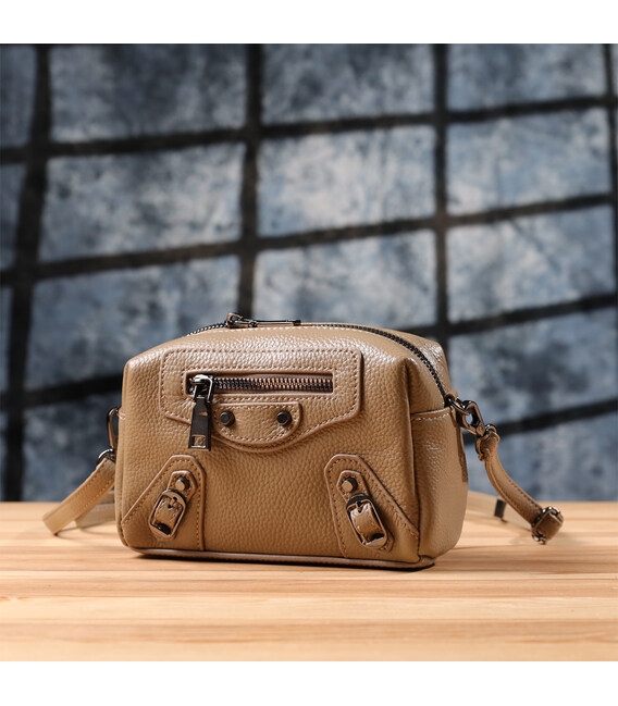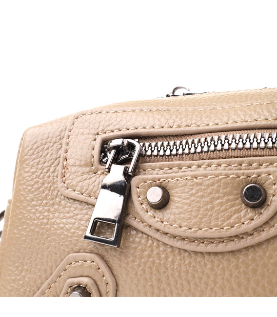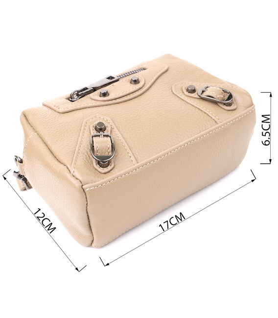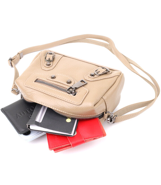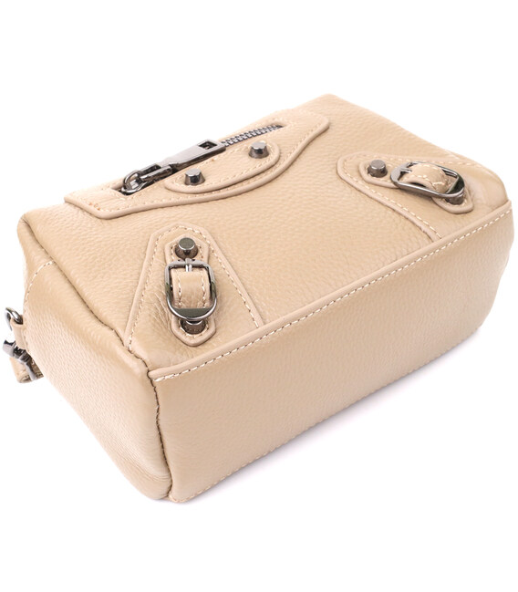 Компактная женская кожаная сумка в бежевом цвете с декоративной фурнитурой — эффектный акцент с характером. Сумка выполнена из натуральной кожи в стильном бежевом цвете, который делает образ светлым, свежим и актуальным. Декоративные элементы играют ключевую роль в дизайне: металлические заклепки, ремешки и фигурная строчка на лицевой стороне придают аксессуару современный, слегка дерзкий вид.