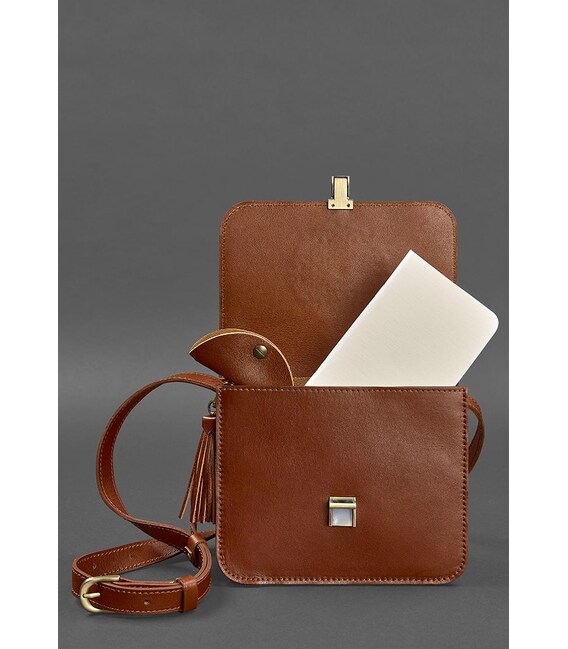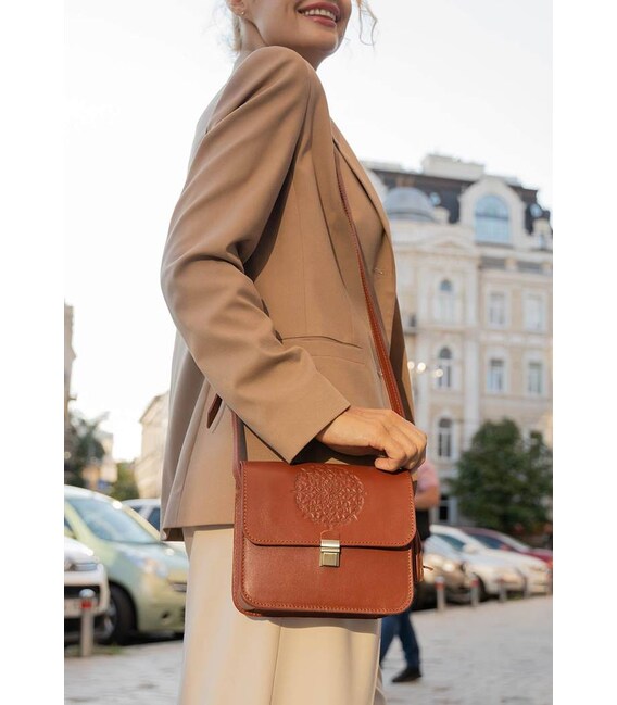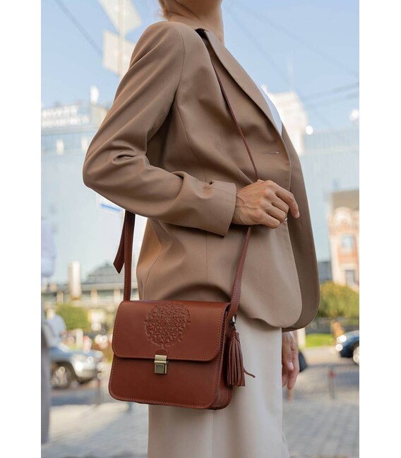 Великолепная и удобная сумка на каждый день, которая надолго задержится в вашем гардеробе, благодаря отличному качеству исполнения и своей универсальности. Она будет прекрасно сочетаться с любым стилем в одежде. Подобный дизайн уместен на любой выход - будь то работа, прогулка или вечеринка.Выполнена сумка вручную из натуральной кожи коньячного оттенка. Дополнена она длинным плечевым ремешком, который можно регулировать исходя из потребностей. Внутри есть одно вместительное отделение и второе поменьше для планшета или блокнота. Также внутри сумки есть несколько кармашков для карточек и других мелочей. Еще в конструкции сумки имеется колечко-люверс, к которому с помощью цепочки можно крепить ключи или кошелек.Закрывается сумка клапаном с портфельным замком. Клапан украшен очень красивым орнаментом в стилизации под индийскую мандалу. Модель дополнена съемным брелоком-кистью.Также в подарок к сумке Вы получите:Тетрадь с орнаментом Холдер для наушников и проводов Съемная кисть, которая может служить украшением или использоваться как брелок.Гарантия на сумку - 3 года с момента покупки.Фурнитура и комплектация может быть изменена производителем