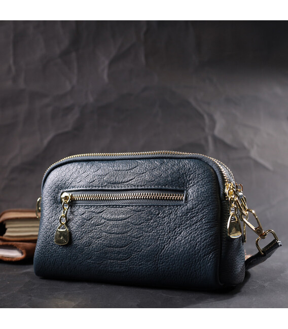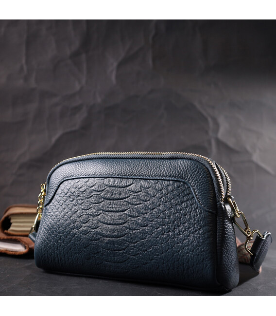Модная женская сумка на два автономных отделения из натуральной кожи с тиснением под змею, которая неприхотлива в уходе и долго носится. Аксессуар состоит из двух основных отделений, потайного кармана на молнии, кармана открытого типа и кармана на молнии снаружи. Носить сумку можно в руках, на плече и через плечо, для этого имеется текстильный съемный ремень. В изделии использована качественная фурнитура цвета желтого золота. Универсальный вариант сумки как на вечер так и в качестве сумочки на каждый день.