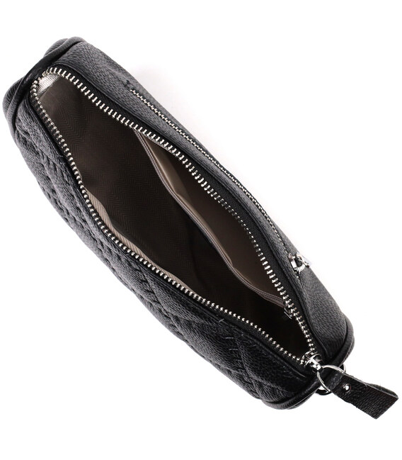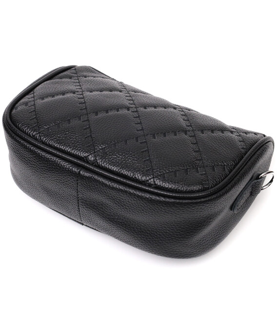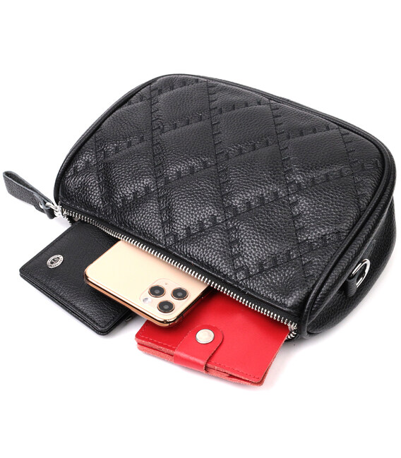 Полукруглая женская стеганая сумка из качественной натуральной кожи, которая долго носится и не теряет свой первоначальный вид. Аксессуар состоит из одного основного отделения, внутри которого расположен карман открытого типа и карман на молнии, а также карман на молнии снаружи, на тыльной стороне. Носить сумку можно в руке как клатч, на плече и через плечо, для этого имеется текстильный съемный ремень. В изделии использована качественная фурнитура серебряного цвета.