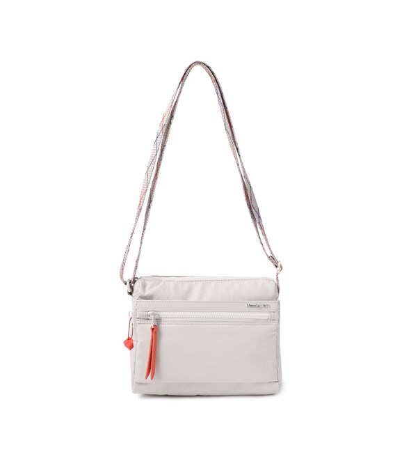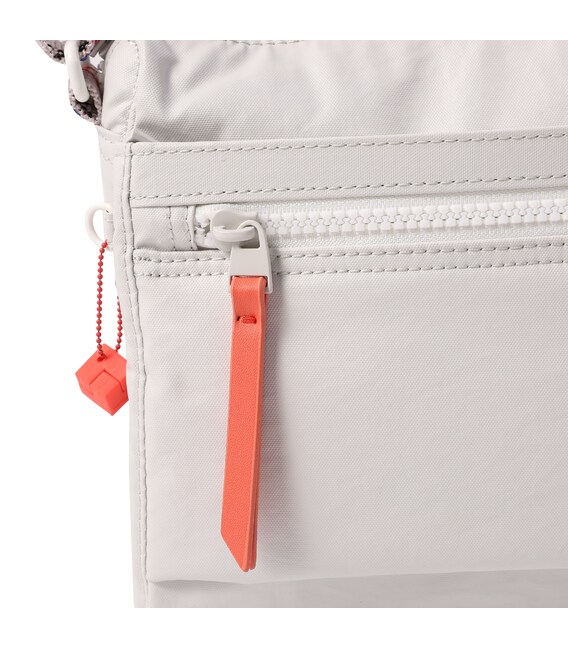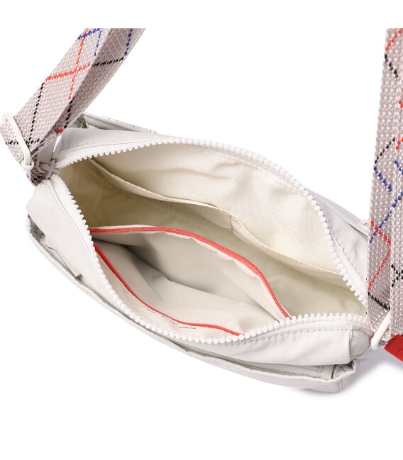 Удобная женская сумка через плечо, небольшого размера изготовлена из переработанного нейлона с водоотталкивающим покрытием. Оснащена ремнем, позволяющим регулировать длину. У изделия есть три отделения на молнии, в одном из которых есть карман на молнии и карман для документов, телефона и мелочей. На фасадной части расположен карман на молнии.