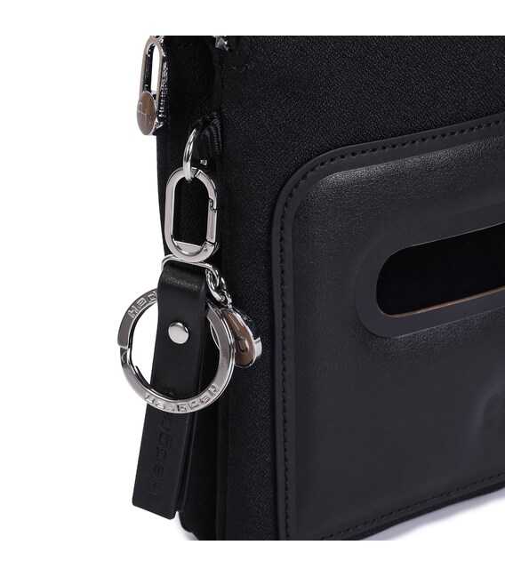 Оснащен двумя наружными карманами на молнии, где в одном из присутствует дополнительный карман с RFID-защитой и крючок для ключей. Снаружи также оснащена не большими карманами, на передней и задней сторонах + изысканная съемная вешалка для ключей. Выполнена из 100% переработанного полиэстера PET (полиэфирная ткань из переработанных пластиковых бутылок).