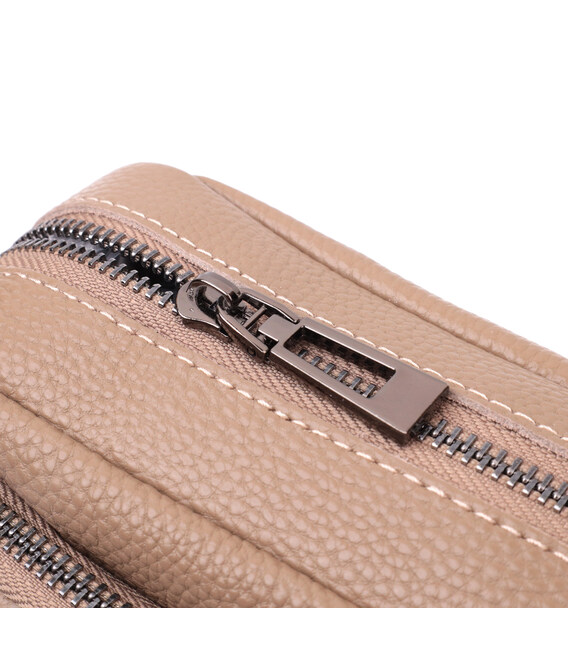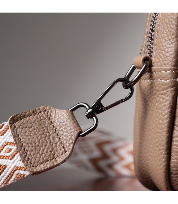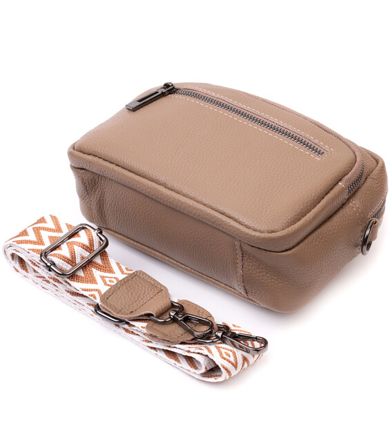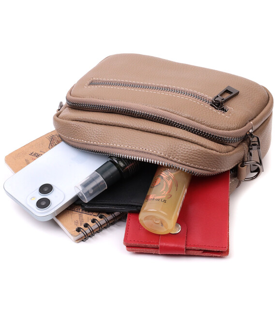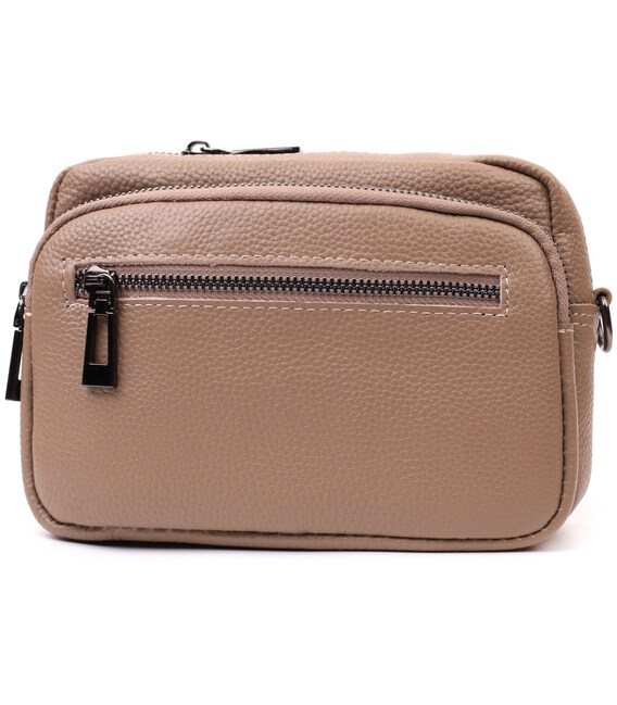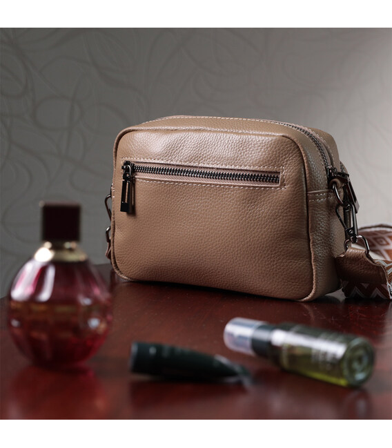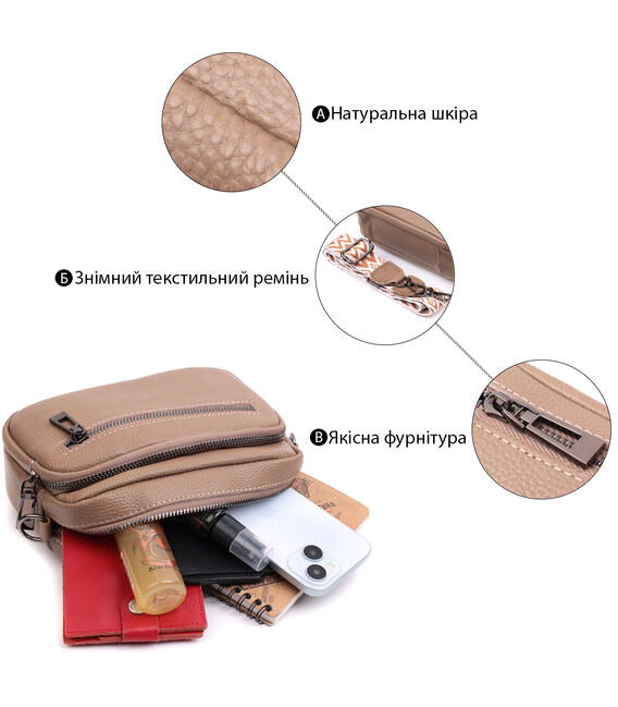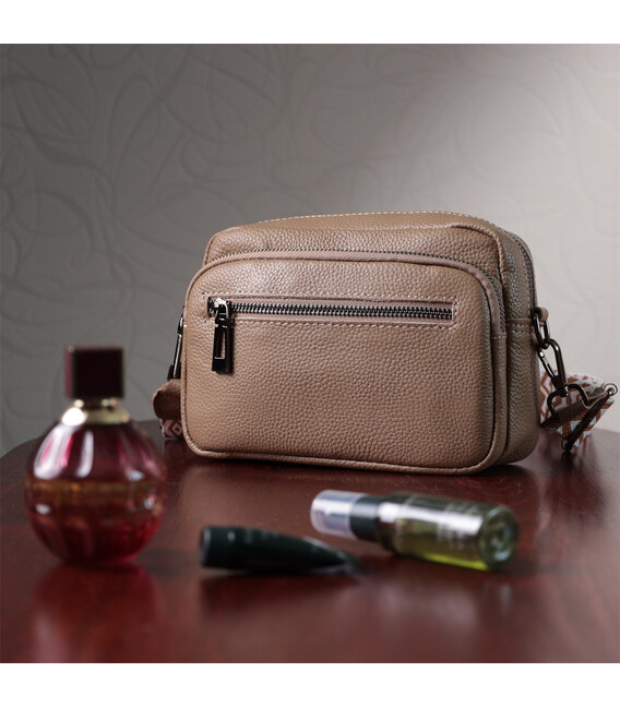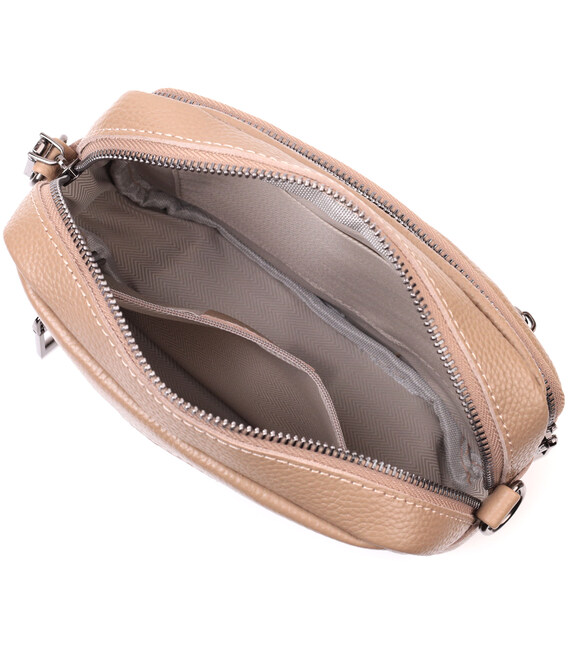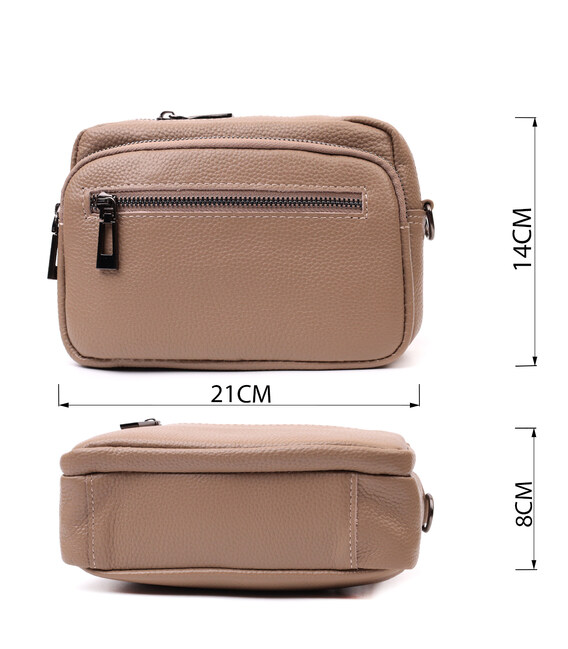 Женская небольшая но вместительная сумка из натуральной кожи. Аксессуар состоит из основного отделения, что закрывается на молнию, кармана открытого типа и кармана на молнии внутри и трех карманов снаружи. Носить сумку можно на плече и через плечо, также можно носить как клатч под рукой, для этого можно снять текстильный ремешок.