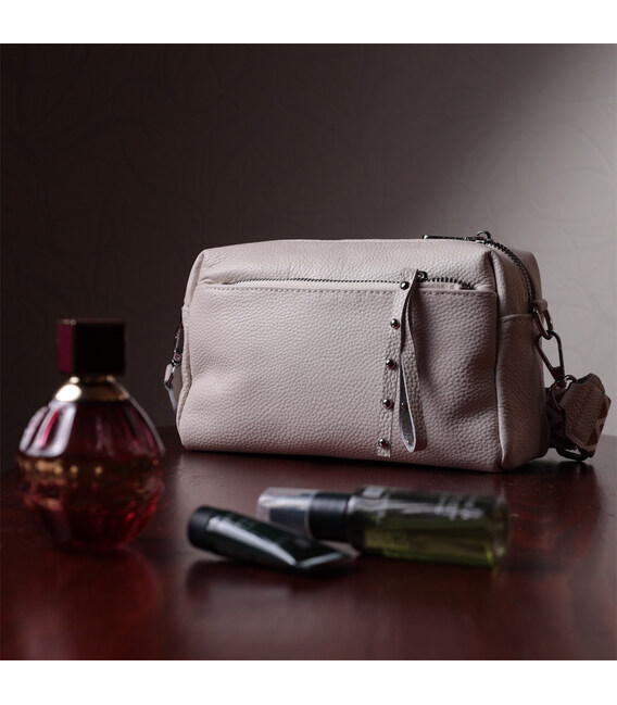 Удивительная женская сумка из натуральной кожи. Аксессуар состоит из основного отделения, что закрывается на молнию, кармана на молнии и кармана открытого типа внутри, двух карманов на молниях снаружи, на тыльной и лицевой стороне. Носить сумку можно на плече и через плечо, для этого имеется съемный текстильный ремень.