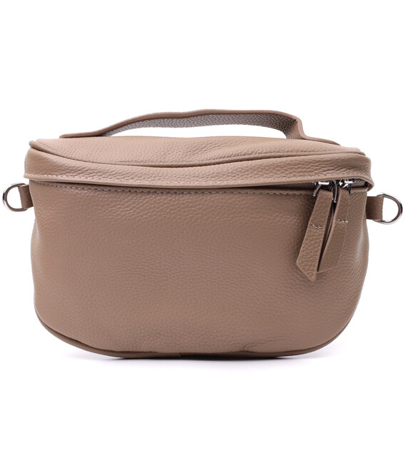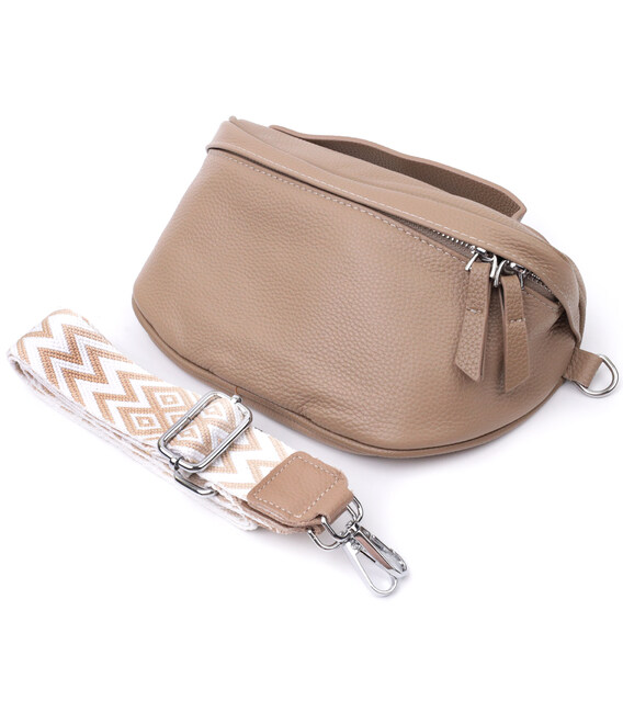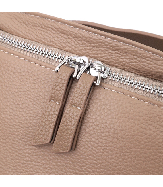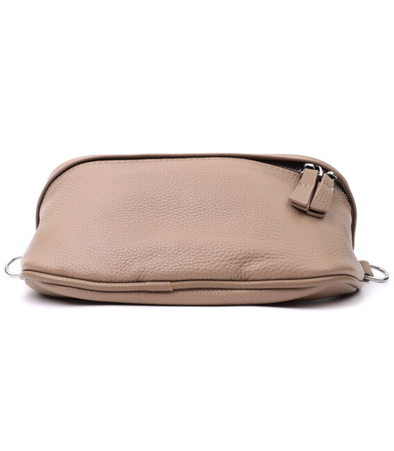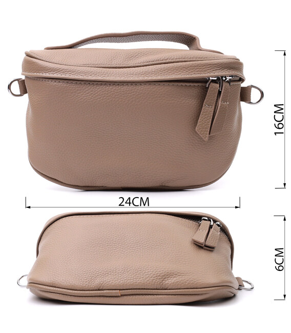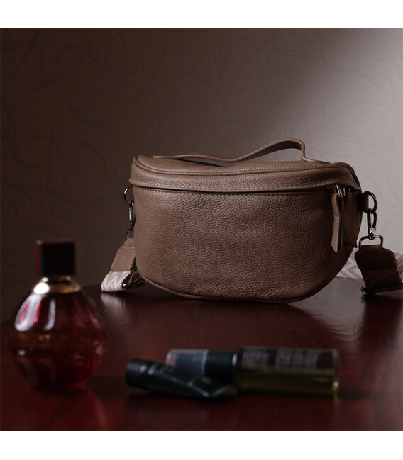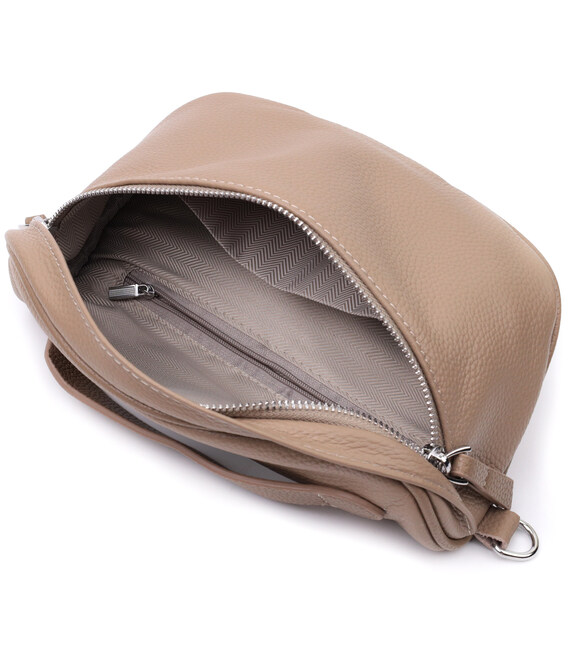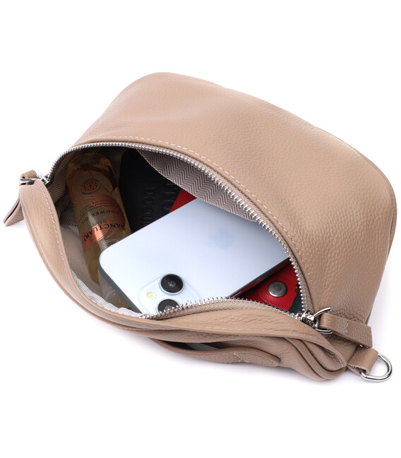 Актуальная в этом сезоне сумка через плечо из натуральной кожи. Аксессуар состоит из основного отделения, что закрывается на молнию, кармана на молнии и кармана открытого типа внутри. Носить сумку можно на плече, через плечо, а также в руках для этого имеется съемный текстильный ремень и кожаная ручка.