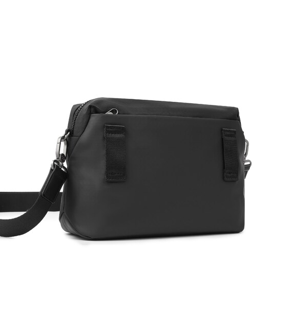 Удобная, компактная сумка через плечо изготовлена из переработанной ткани в сочетании с эко-кожей. Оснащена основным отделением на молнии с отделом для смартфона и дополнительным карманом на молнии с RFID-защитой. На заднем кармане изделия предусмотрена утопленная молния, которая плотно прилегает к телу, как дополнительное средство безопасности, также дополнительно оснащен шлейкой, позволяющей закрепить его на стандартном ремне для одежды. Имеет съемный и регулируемый по длине ремень.