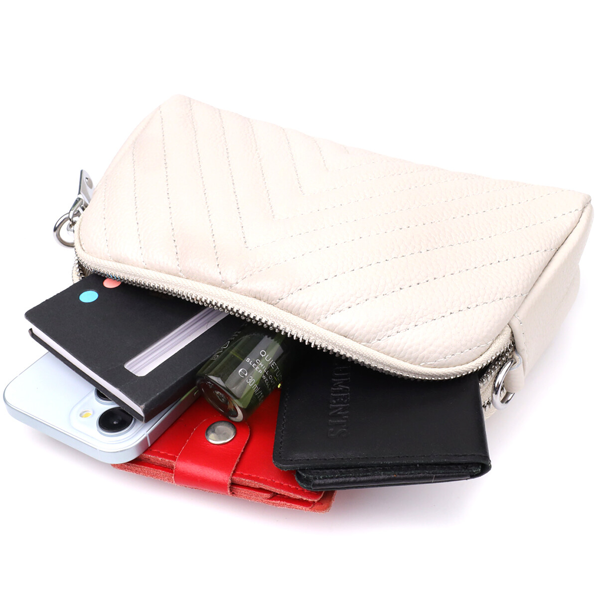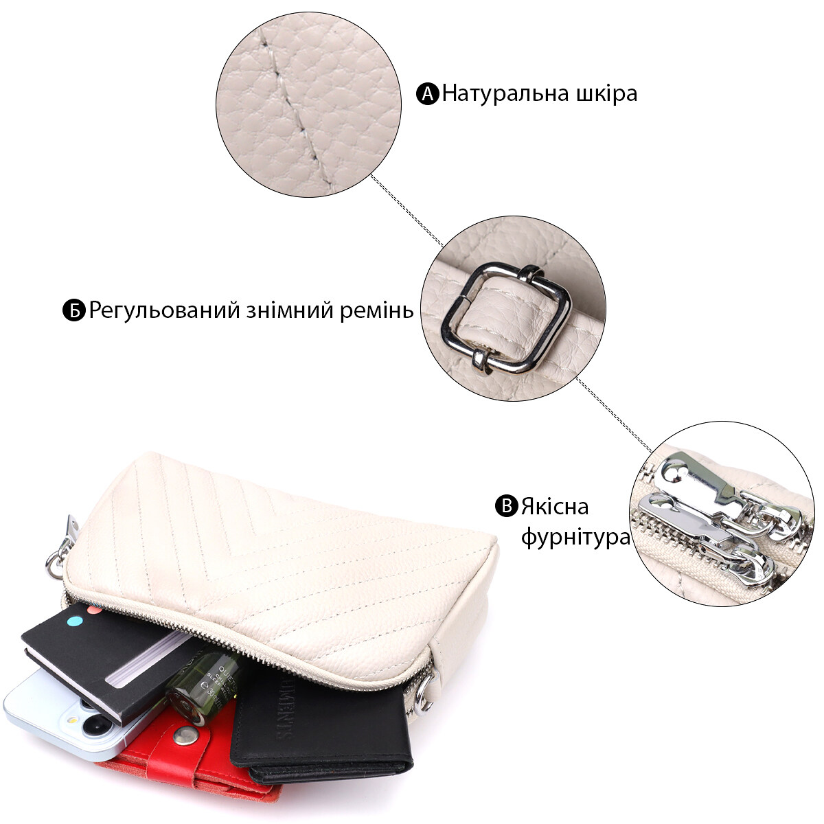 Белая кожаная сумка с треугольной прострочкой — это безупречный выбор для тех, кто ценит лёгкость, стиль и внимание к деталям.