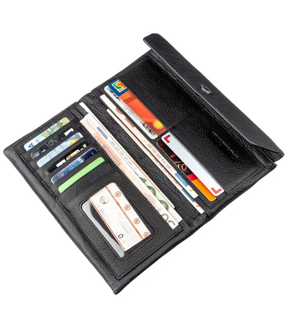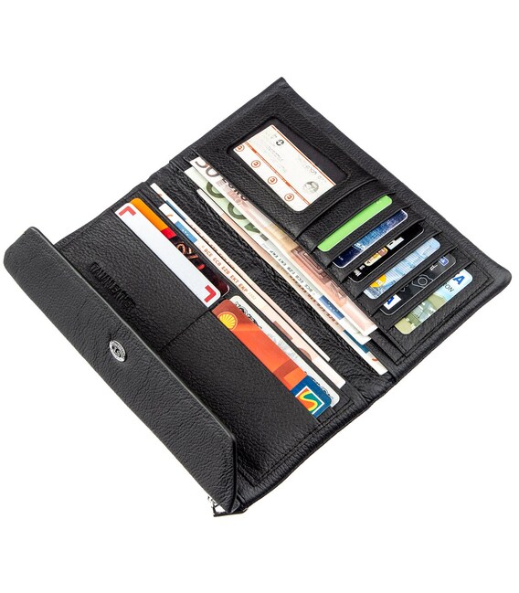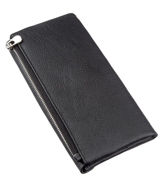 Незаурядный женский клатч на все случаи жизни из натуральной кожи. Выполнен в черном цвете, благодаря чему, подойдет под любой гардероб своей хозяйки. Вас обязательно удивит высокое качество данного аксессуара, а значит, он прослужит Вам очень долго. В данный кошелек-клатч поместится все необходимое, от денежных купюр до кредитных карточек. На тыльной стороне расположен карман на молнии для монет или других ценных мелочей, что очень удобно и практично. Вы можете приобрести изделие, как для себя любимой, так и на подарок близкому человеку. В любом случаи владелица кошелька останется довольной. Упакован клатч в фирменную коробку белого цвета из картона.