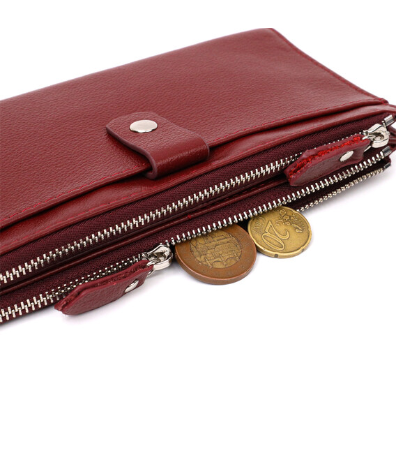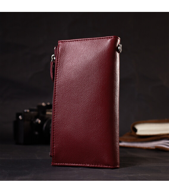 Яркий и практичный женский кошелек в красивом женственном бордовом цвете. Выполнен из добротной натуральной кожи и имеет мягкую зернистую фактуру. Аксессуар состоит из трех отделений для купюр, одиннадцати слотов для карточек, прозрачной ячейки, снаружи - прилегающий карман, что закрывается хлястиком на кнопку, а также два кармана на молниях по бокам. Носить этот кошелек-клатч можно в руке и на запястье, для этого предусмотрен съемный кожаный ремешок. Упаковка – белая фирменная коробка.