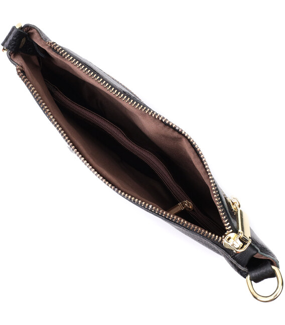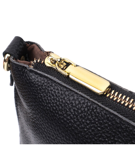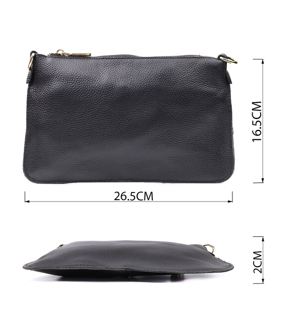 Интересная женская функциональная сумка-клатч из натуральной кожи. Аксессуар состоит из основного отделения, что закрывается на молнию, кармана-перегородки на молнии внутри и кармана на молнии на тыльной стороне, снаружи. Носить сумку можно на плече и через плечо, также можно носить как клатч под рукой и на кисти, для этого имеется длинный съемный ремешок, а также съемный кистевой ремень.