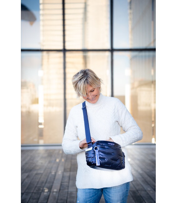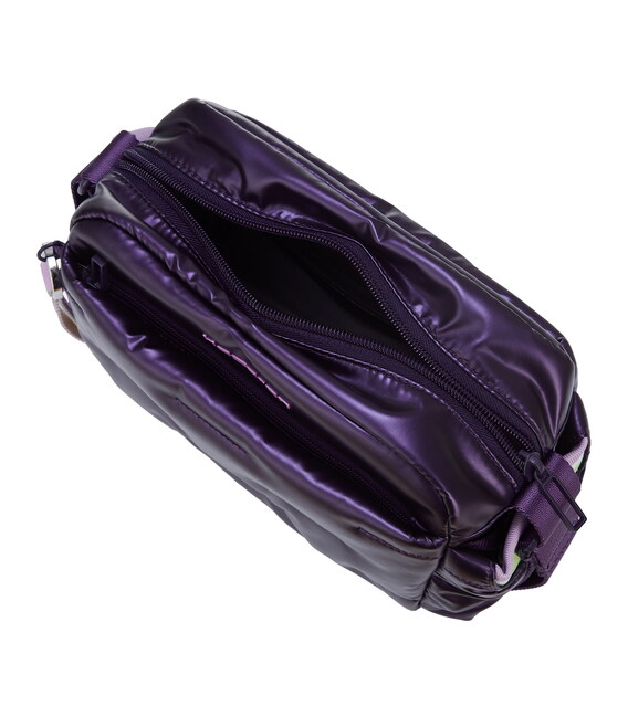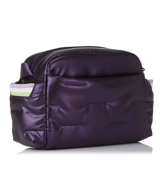 Вместительная, дутая сумка через плечо, освобождает руки и дает возможность быстро воспользоваться предметами первой необходимости в дороге или каждый день. Оснащена тремя отделениями на молнии и боковыми карманами для мелочей с карабином для ключей. В основном отделении 2 небольших кармана и съёмная, водоотталкивающая косметичка на молнии. Выполнена из плотного 100% polyester.