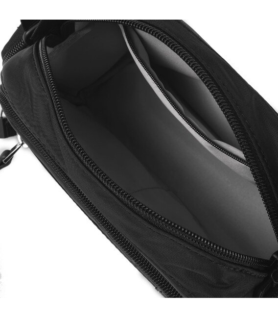 Удобная и компактная сумка через плечо, небольшого размера изготовлена из прочной ткани с ремнем, что позволяет регулировать длину. В изделии есть основное отделение на молнии, в котором расположен карман с RFID-защитой от мошенничества, а также отдел для телефона и мелочей. На фасадной части изделия накладные карманы спереди и с обеих сторон закрываются молнией с качественной фурнитурой.